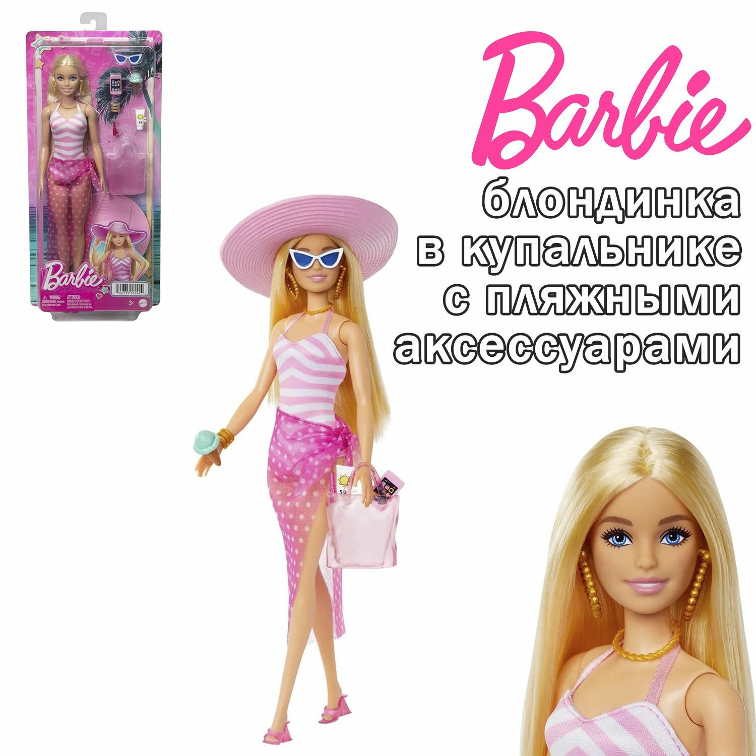 Кукла Barbie Beach day Барби блондинка в купальнике с пляжными аксессуарами.