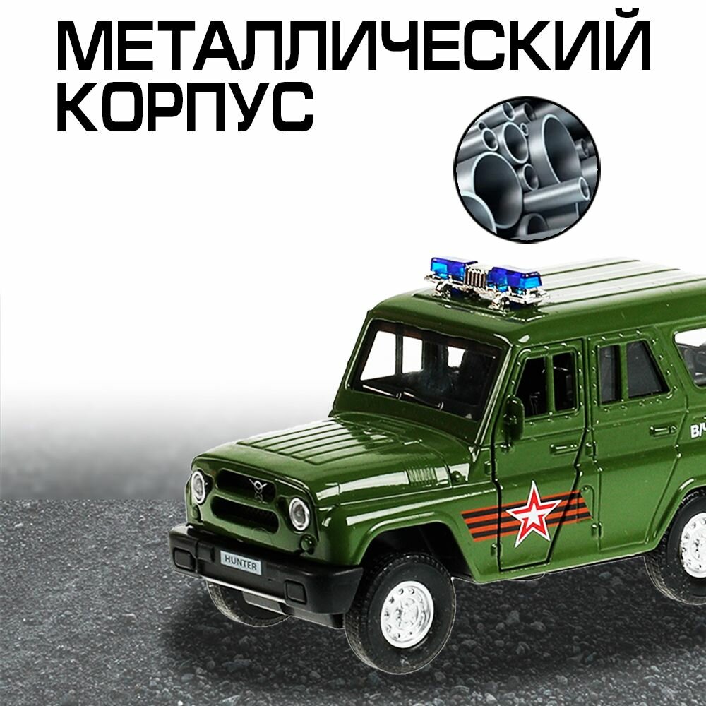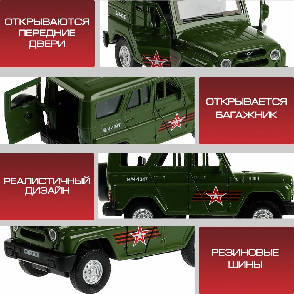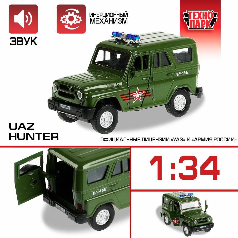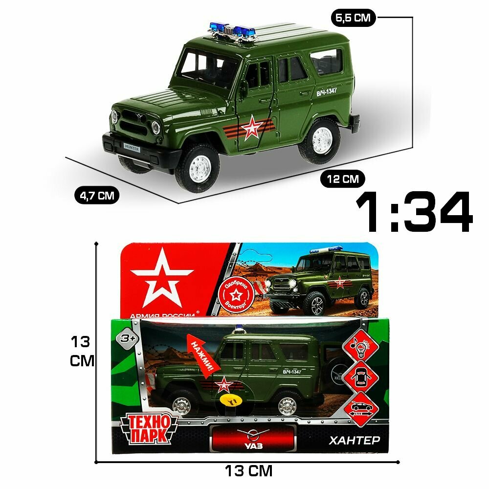 Купить Машинка детская УАЗ Хантер Военный 12 см, Технопарк, зеленая, открываются двери и багажник, металлическая, свет и звук