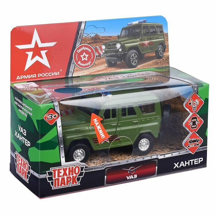 СохранитьМашинка детская УАЗ Хантер Военный 12 см, Технопарк, зеленая, открываются двери и багажник, металлическая, свет и звук интересное: