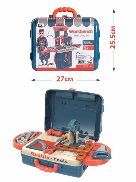 | Комплектация | отвертки, пила, ключи гаечные, шурупчики, верстак, молоток, гайка, плашка |
