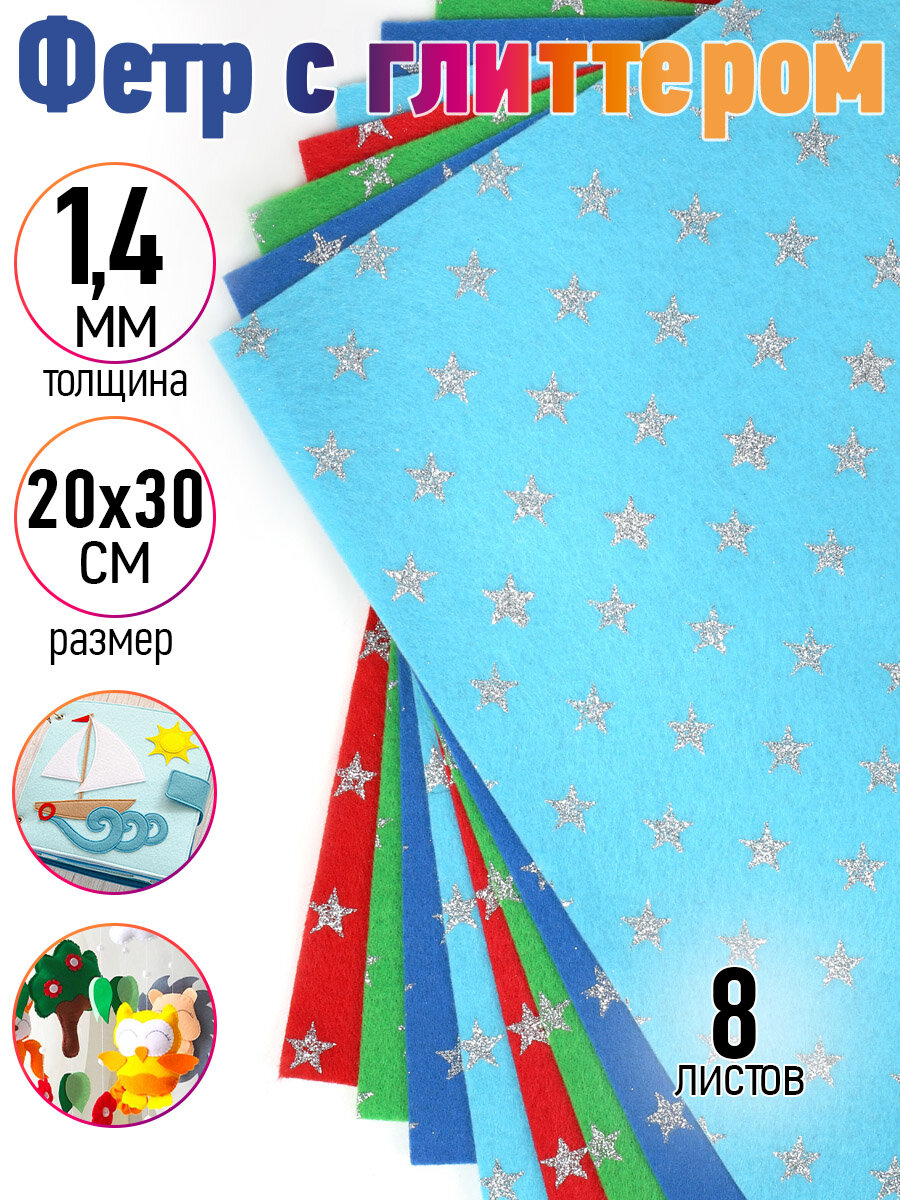 Фетр с глиттером для рукоделия Звезды IDEAL 1,4мм 20х30см арт. FLT-GLP2 уп.8 листов цв. ассорти