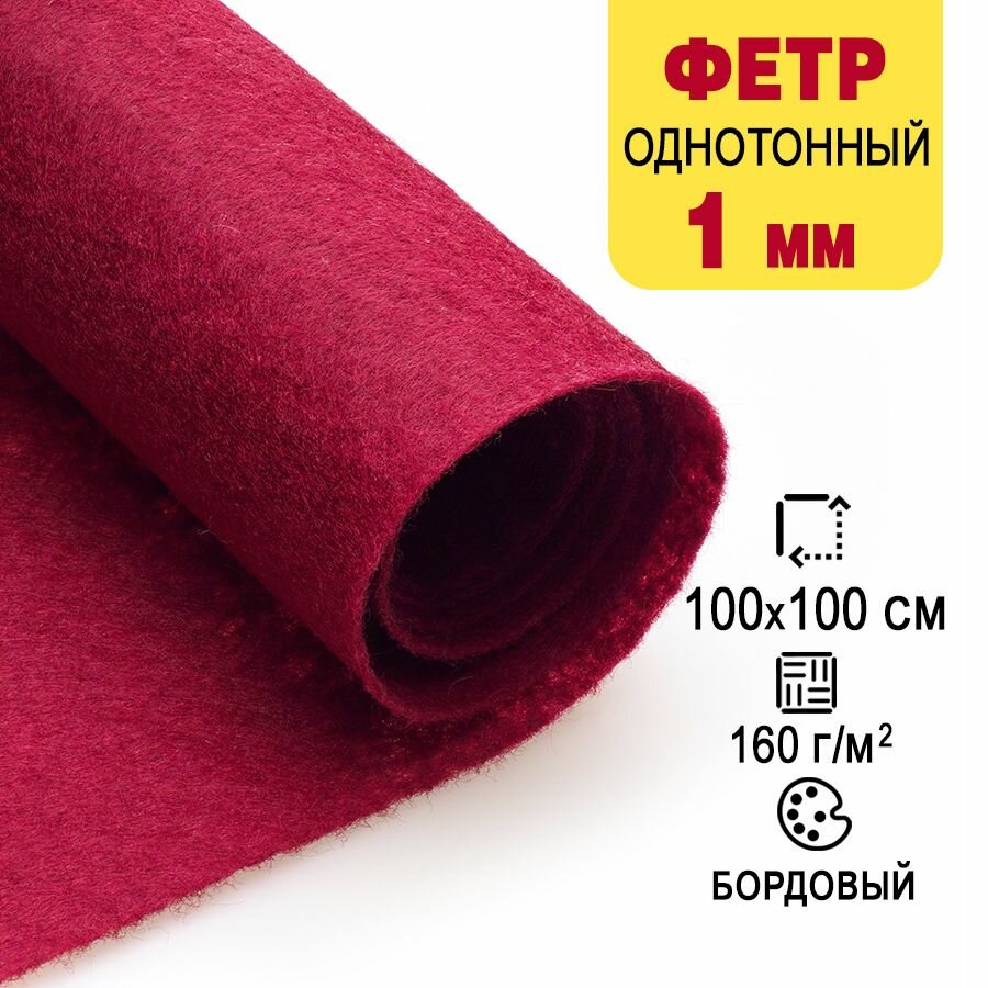 Купить Фетр однотонный твердый 1 мм в рулоне 100 х 100 см, бордовый С01, плотность 160г/м2