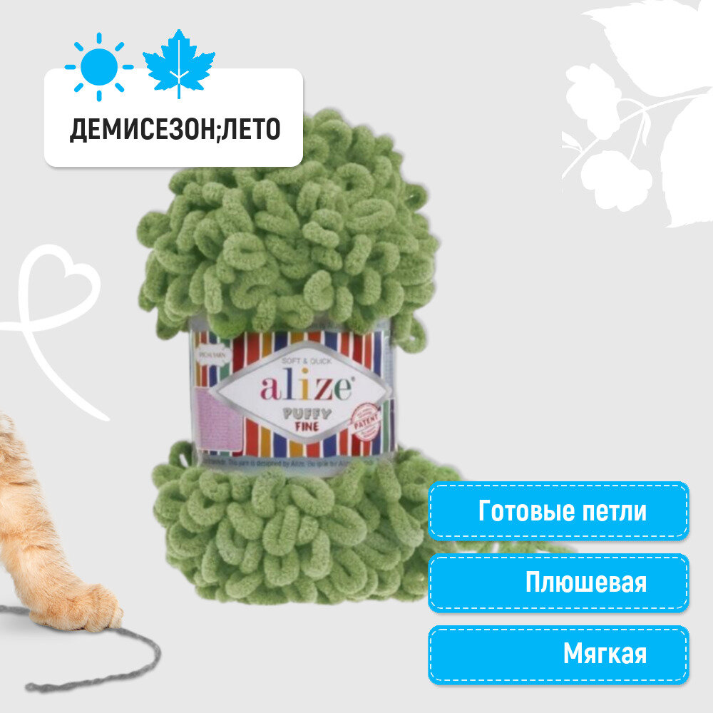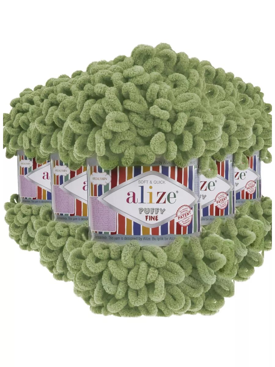 Пряжа плюшевая Alize Puffy Fine (Пуффи Файн) - 5 мотков 485 зеленый, для вязания рукми, маленькие петельки (2см), 100г 14м