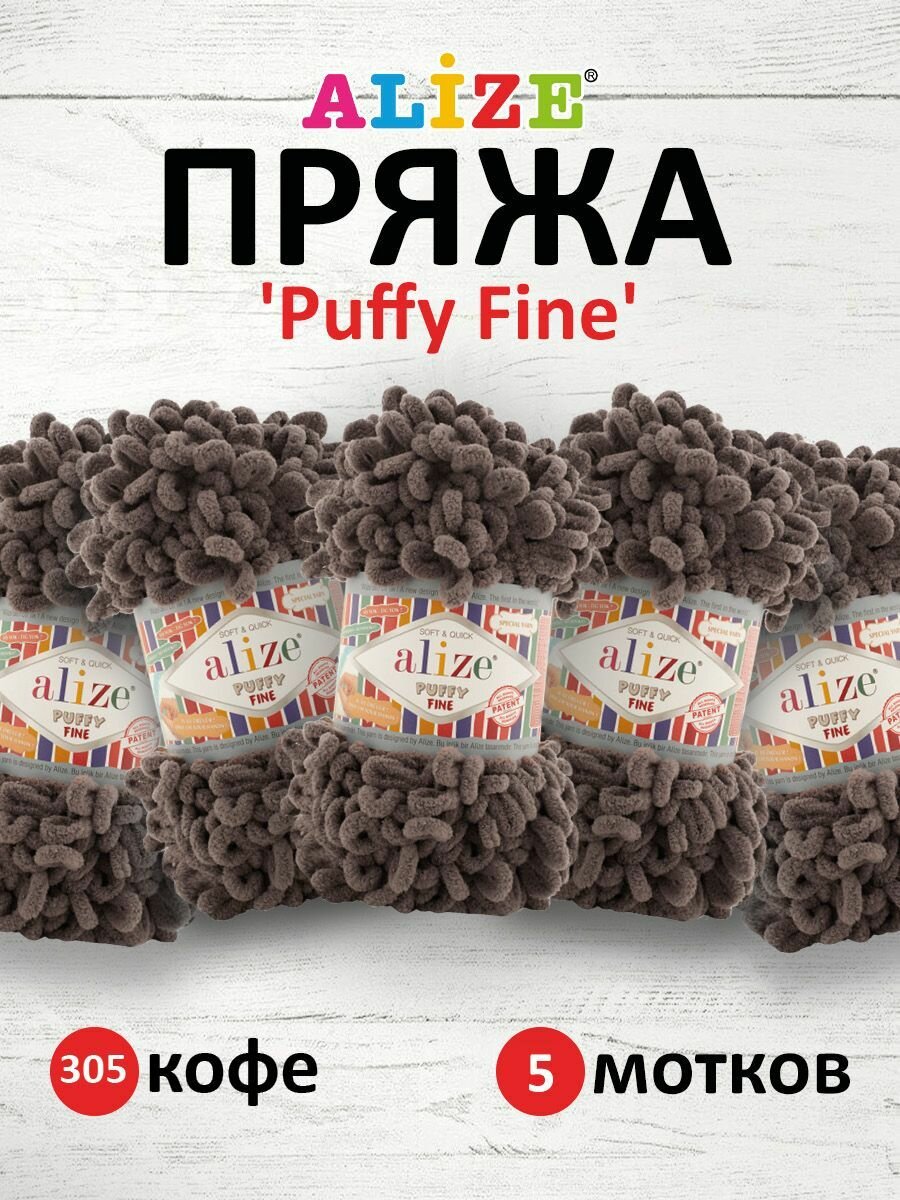 Пряжа плюшевая Alize Puffy Fine (Пуффи Файн) - 5 мотков 305 кофе, для вязания рукми, маленькие петельки (2см), 100г 14м