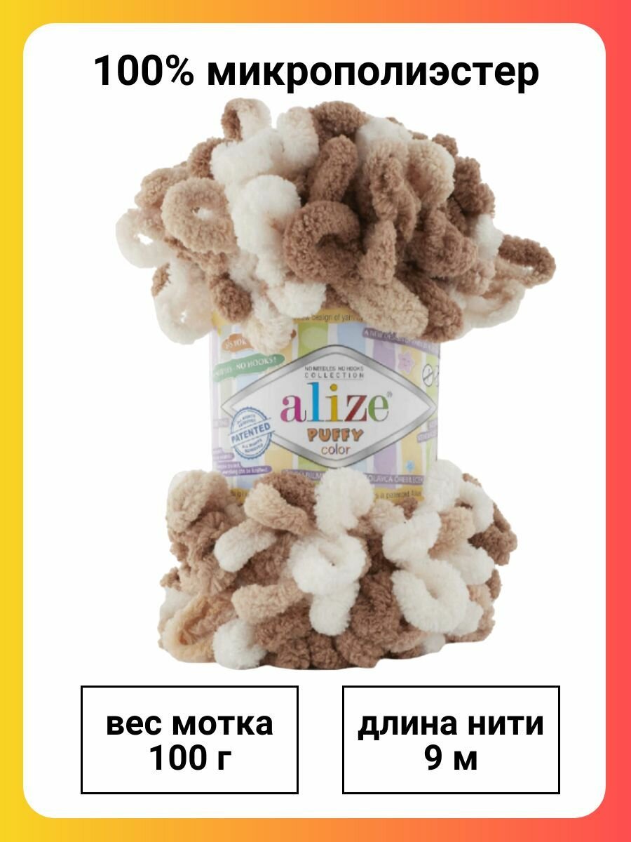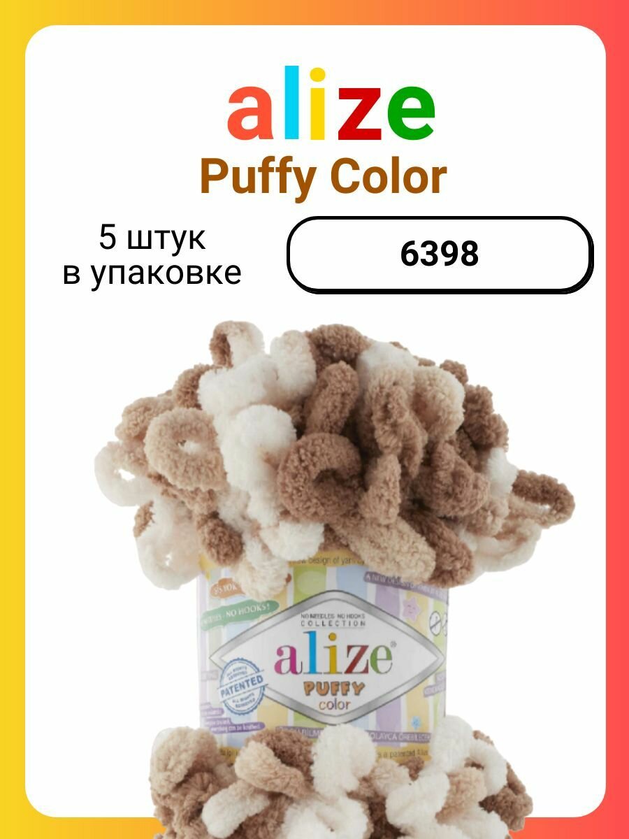 Пряжа Alize Puffy color белый-бежевый-коричневый (6398), 100%микрополиэстер, 9м, 100г, 1шт