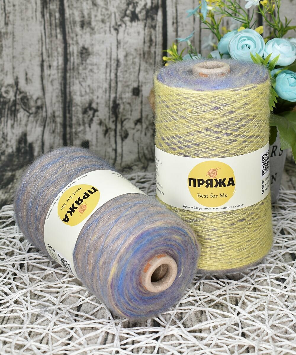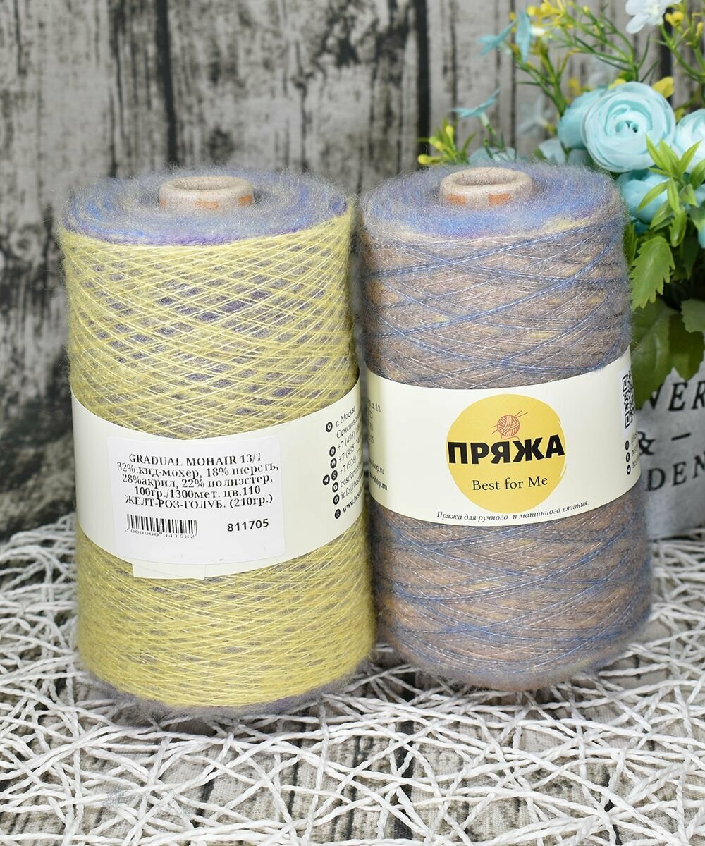 Пряжа на бобине Кид-мохер с длинным переходом цвета цв.105 ГОЛУБ-ЖЕЛТ-СИРЕНЬ (250гр.)