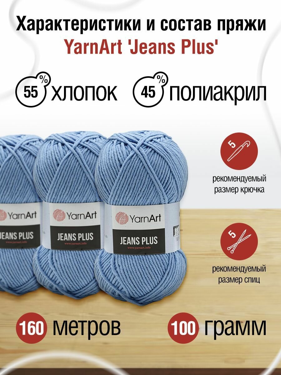 Пряжа для вязания YarnArt 'Jeans Plus' 100г, 160м (55% хлопок, 45% полиакрил) (75 голубой), 5 мотков