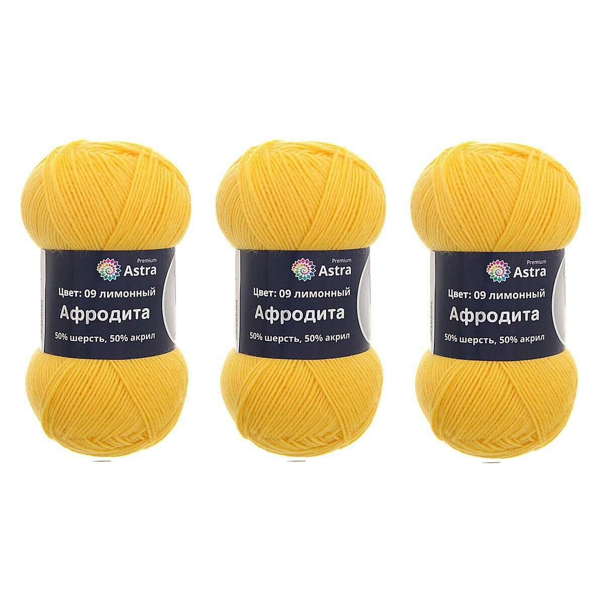 Пряжа Astra Premium 'Афродита' 100гр. 250м (50% шерсть, 50% акрил) (09 лимонный). В комплекте 3 штук.