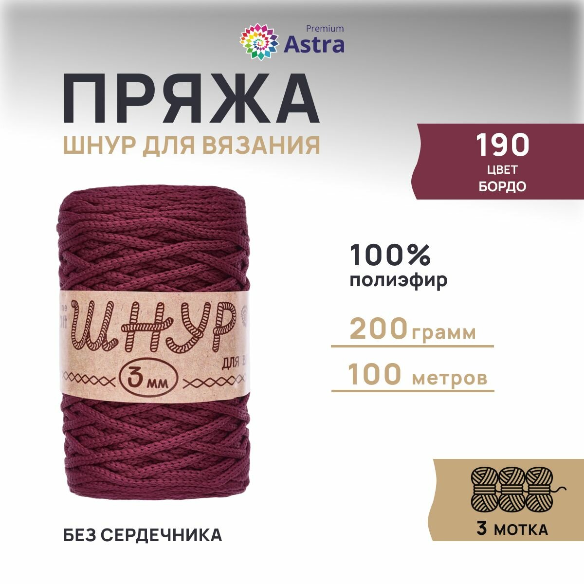 Пряжа для вязания Astra Premium 'Шнур для вязания 3 мм', 200г, 100м (100% полиэфир) (190 бордо), 3 мотка