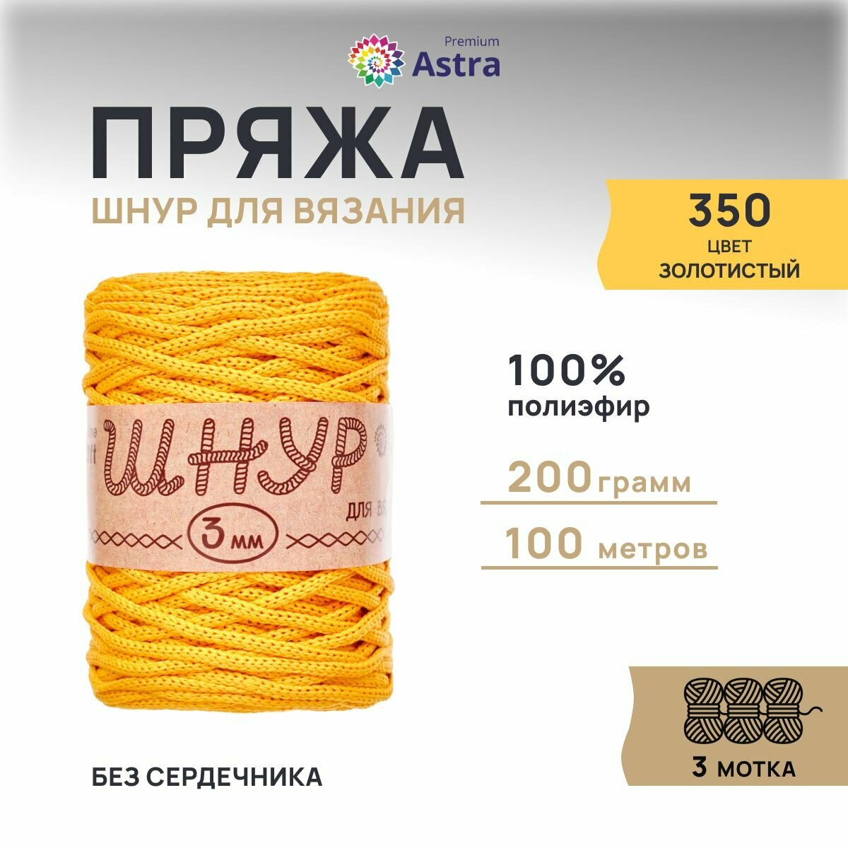 Пряжа для вязания Astra Premium 'Шнур для вязания 3 мм', 200г, 100м (100% полиэфир) (350 золотистый), 3 мотка