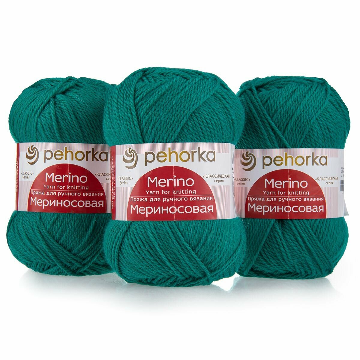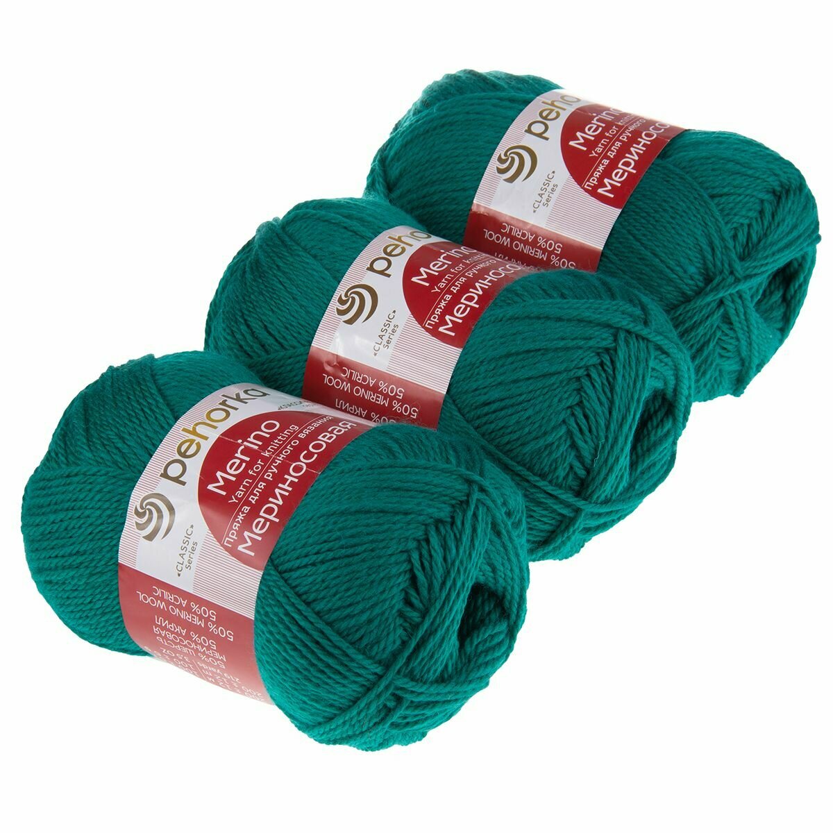 Купить Пряжа для вязания Пехорка Мериносовая цвет 335 - Изумруд, комплект 3 мотка, 50% шерсть мериноса, 50% акрил, длина мотка 200м, вес 100г.