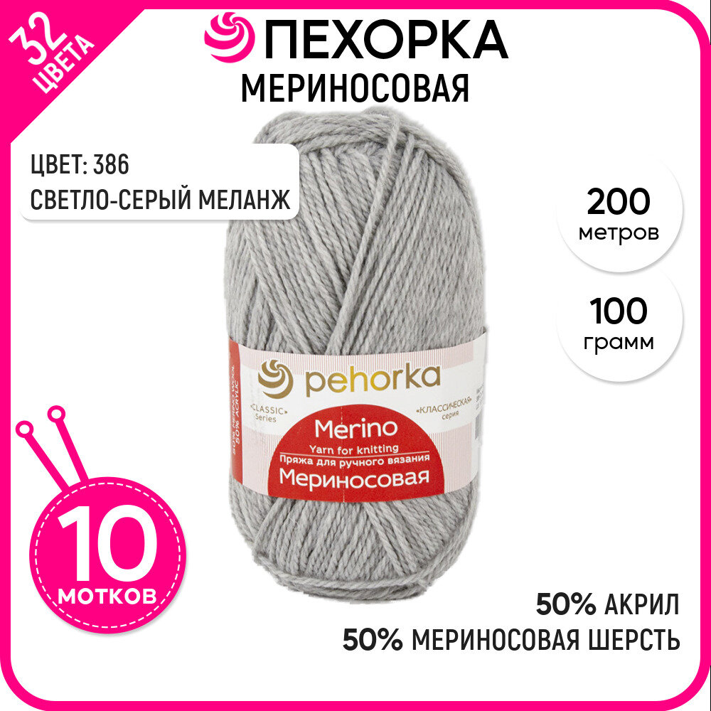 Купить Пряжа полушерсть Пехорка Pehorka Мериносовая средняя, шерсть мериносовая/акрил, цвет 386, светло-серый меланж, 10 шт. по 100 г, 200 м