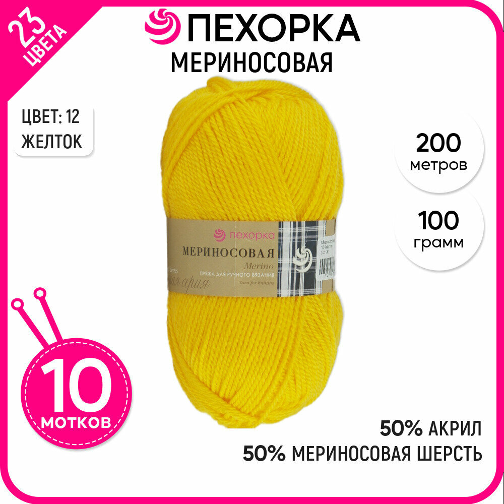 Купить Пряжа для вязания Пехорка 'Мериносовая' 100г, 200м (50% шерсть, 50% акрил) (12-Желток), 10 мотков