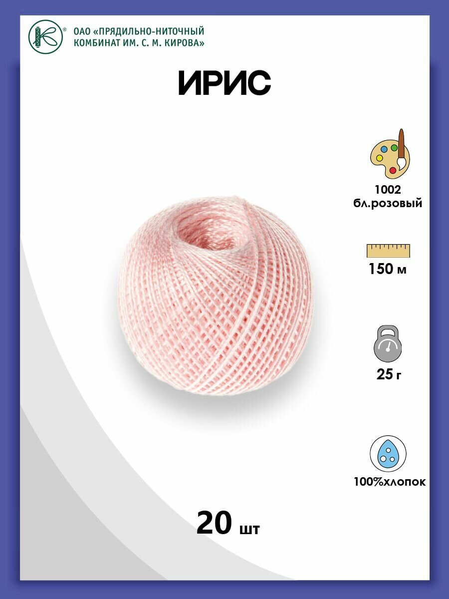 Пряжа ПНК Кирова Ирис светло-розовый (1002), 100%мерсеризованный хлопок, 150м, 25г, 1шт