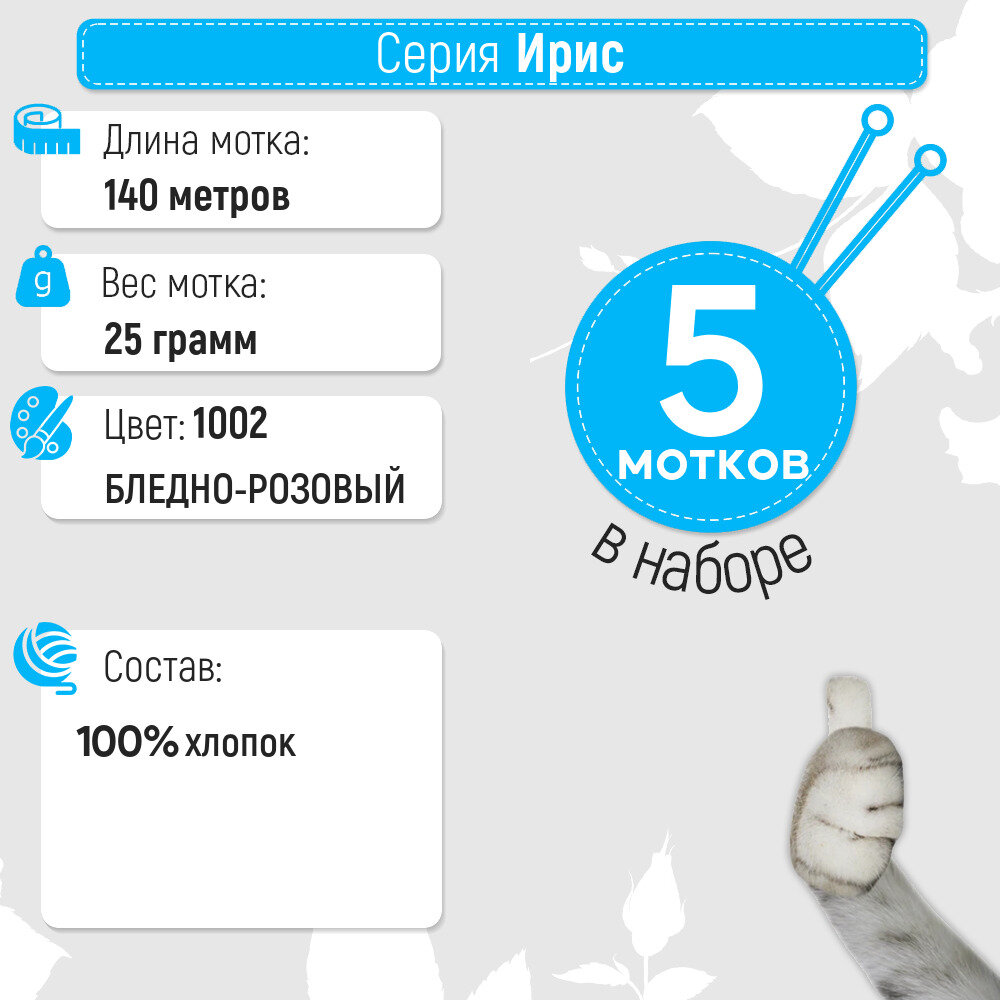 СохранитьПряжа СПБ Ирис 100% мерсеризованный хлопок 20 шт. х 25 г 150 м №1002 (023) св.розовый интересное: