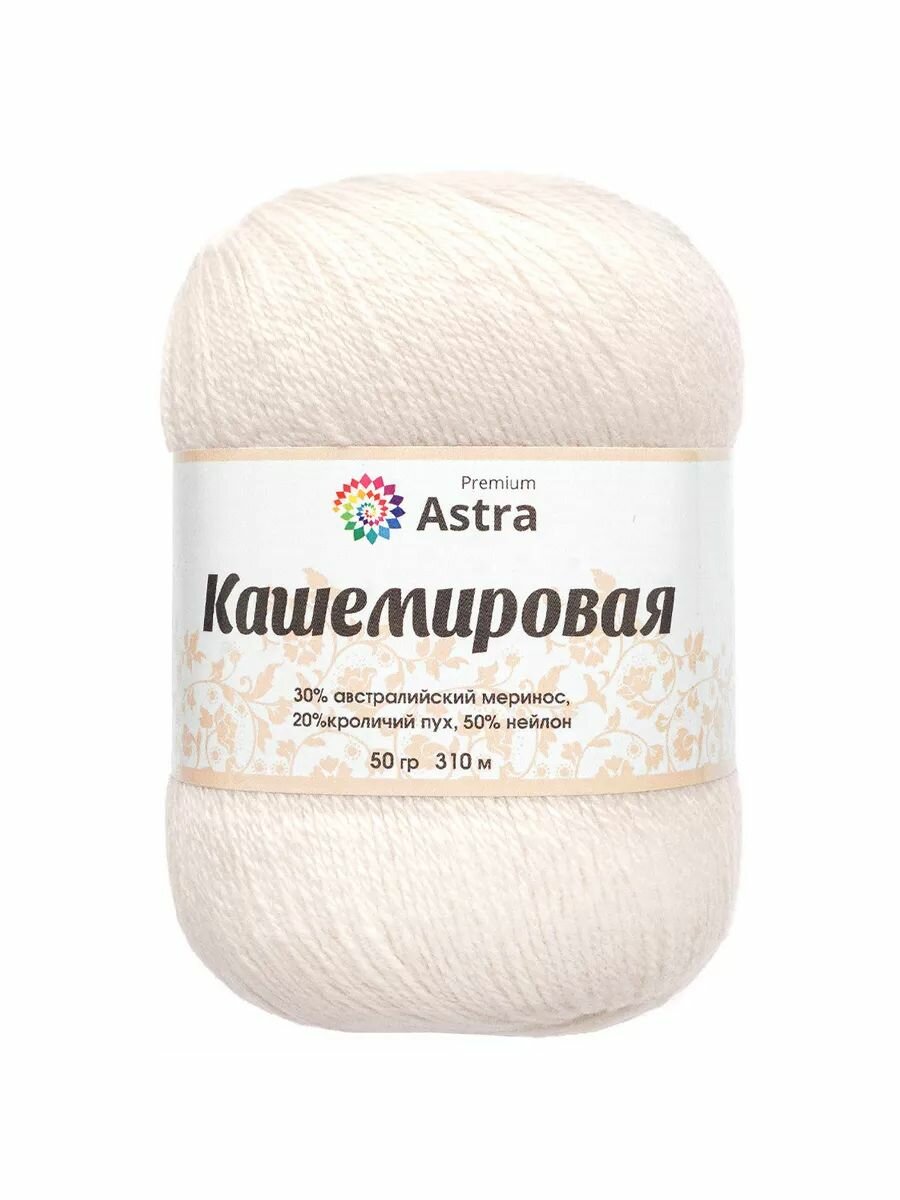 Пряжа для вязания Astra Premium 'Кашемировая' (Cashmere), 50г, 310м (20% кроличий пух, 30% австралийский меринос, 50% нейлон) + нить 20г (001 белый)
