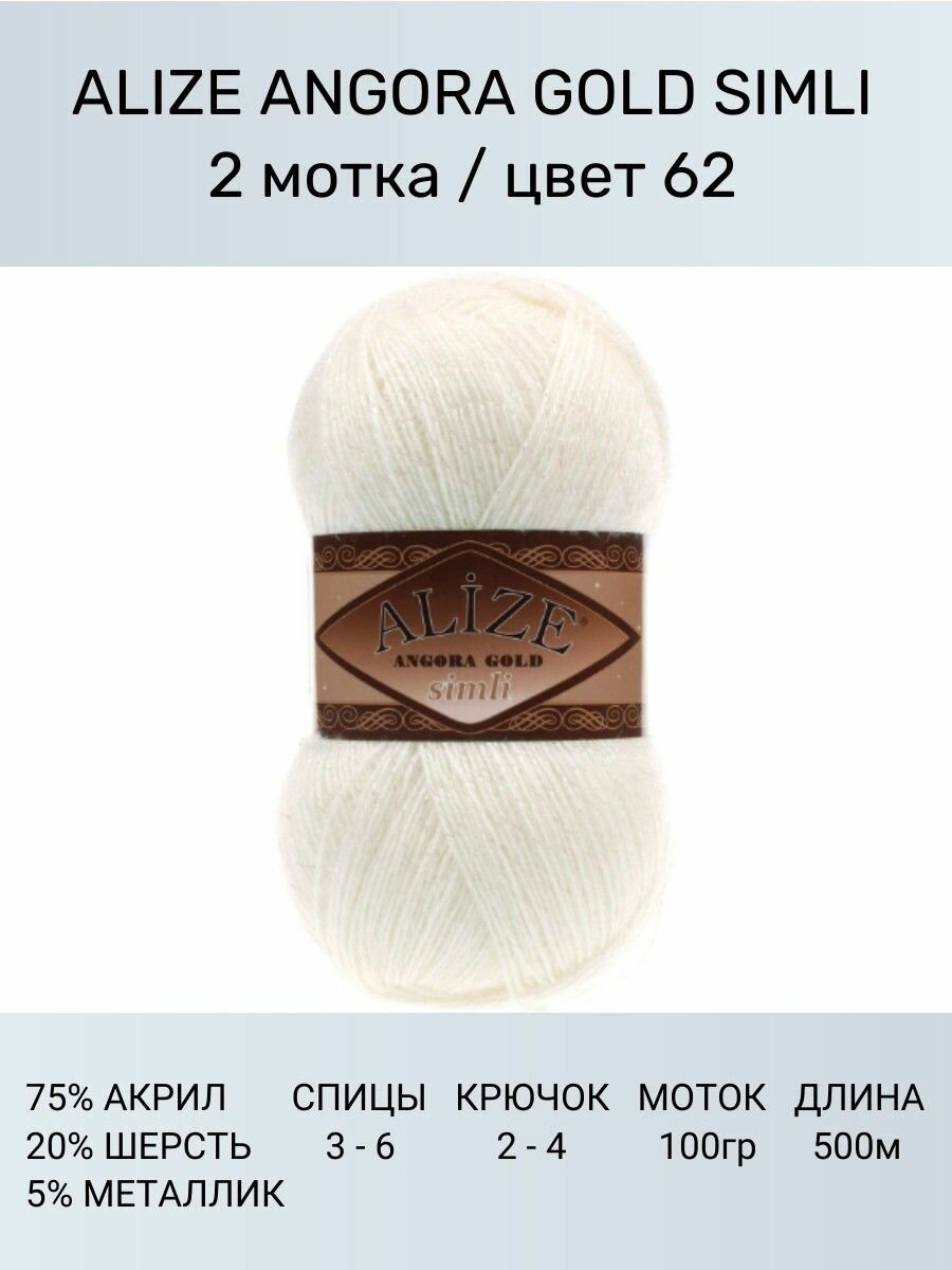 Пряжа ALIZE ANGORA GOLD SIMLI, молочный - 62, 5% металлик, 20% шерсть, 75% акрил, 5 мотков, 100 г, 500 м.
