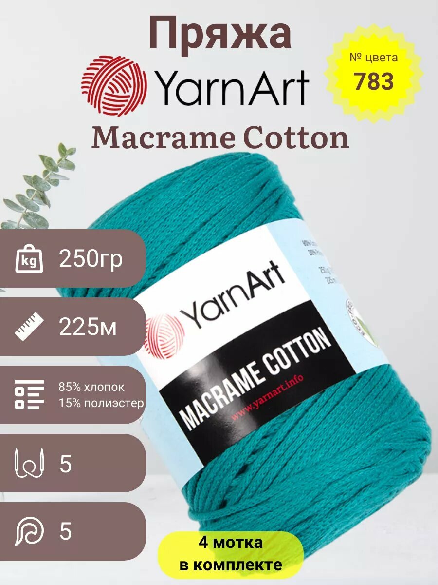 СохранитьПряжа для вязания и плетения YarnArt Macrame Cotton, цвет 783 изумрудный, моток 250г, 225м, 4 мотка интересное: