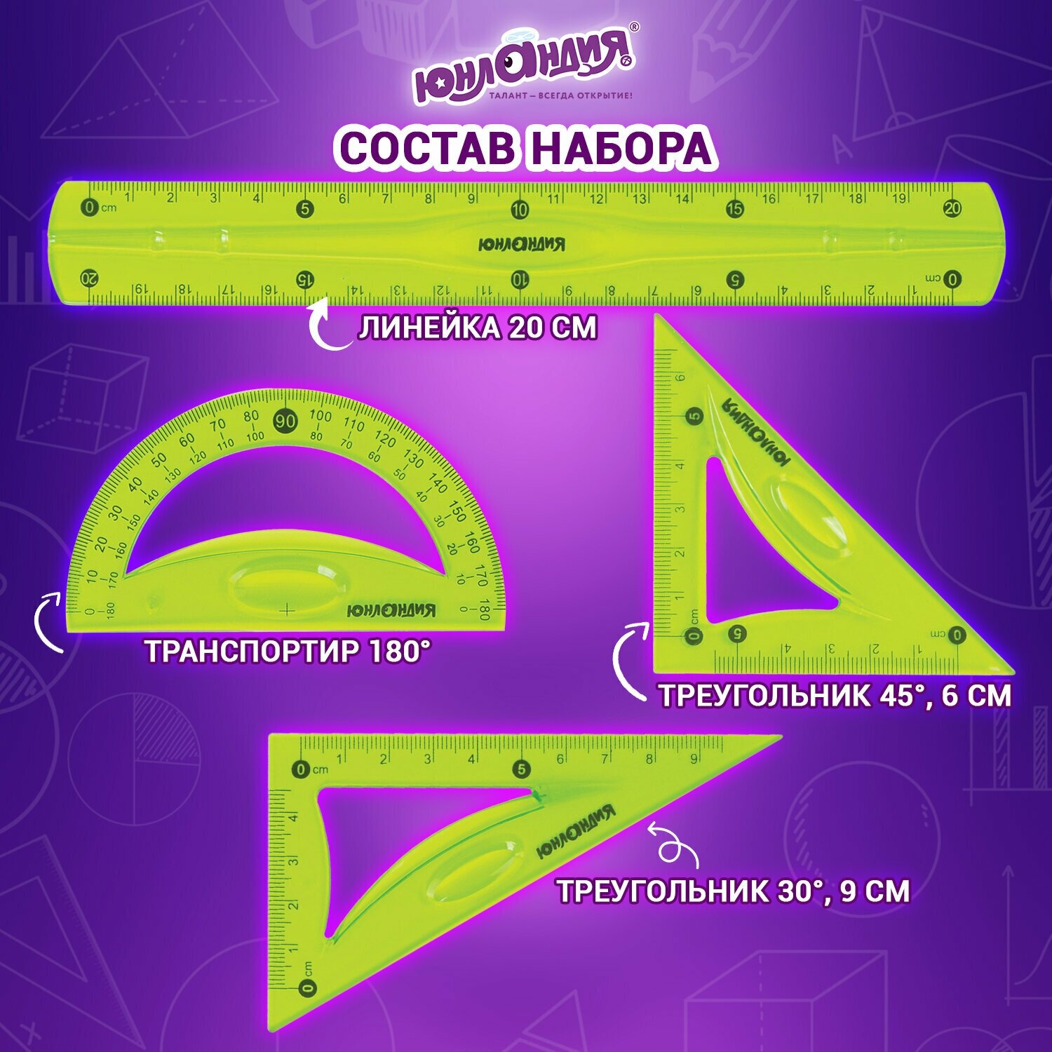 | Комплектация | линейка -1 шт / транспортир 180' - 1 шт / треугольник 45' - 1 шт / треугольник 30' - 1 шт |