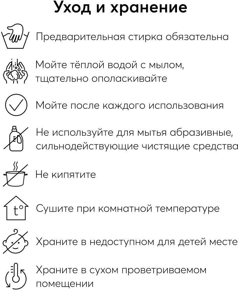 | Дополнительная информация | -Мыть теплой водой с мылом, тщательно ополаскивать -Не кипятить -Предварительная стирка обязательна |
