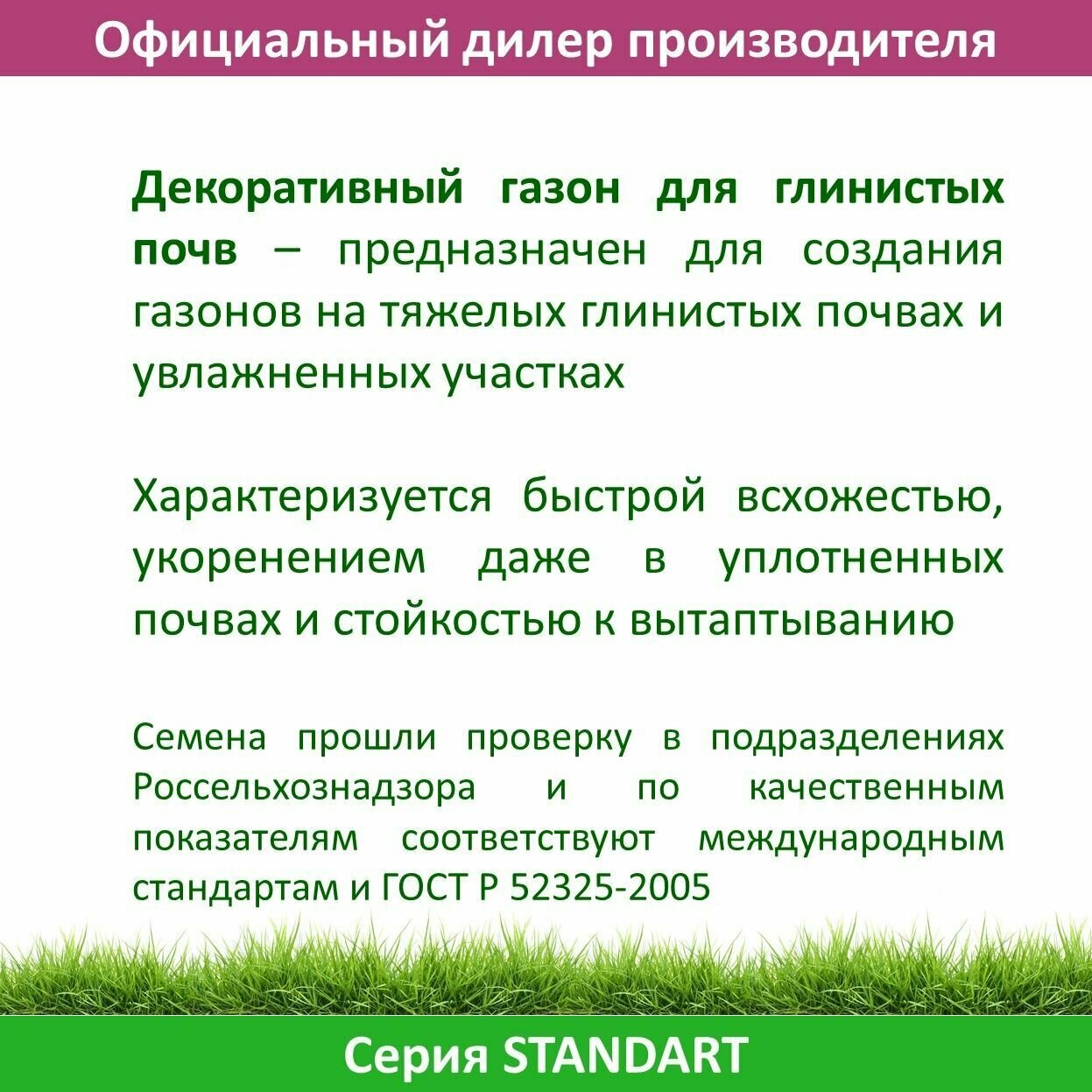 | Особенности | быстрорастущий / влагоустойчивый / засухоустойчивый / износоустойчивый / низкорослый / смесь / теневыносливый |