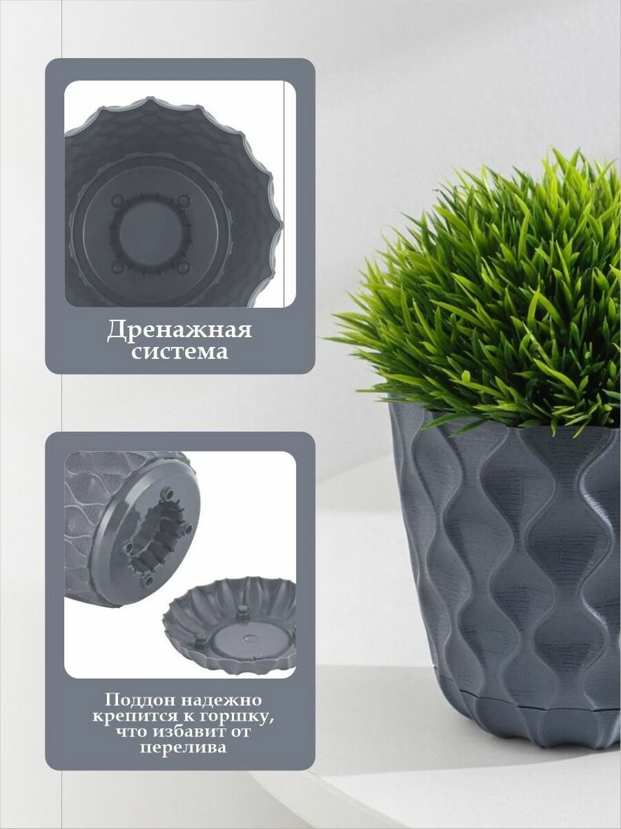 Горшок для цветов пластиковый 2,5л d-17,5см «Wave» с дренажной сеткой и съемным поддоном, вулканический серый