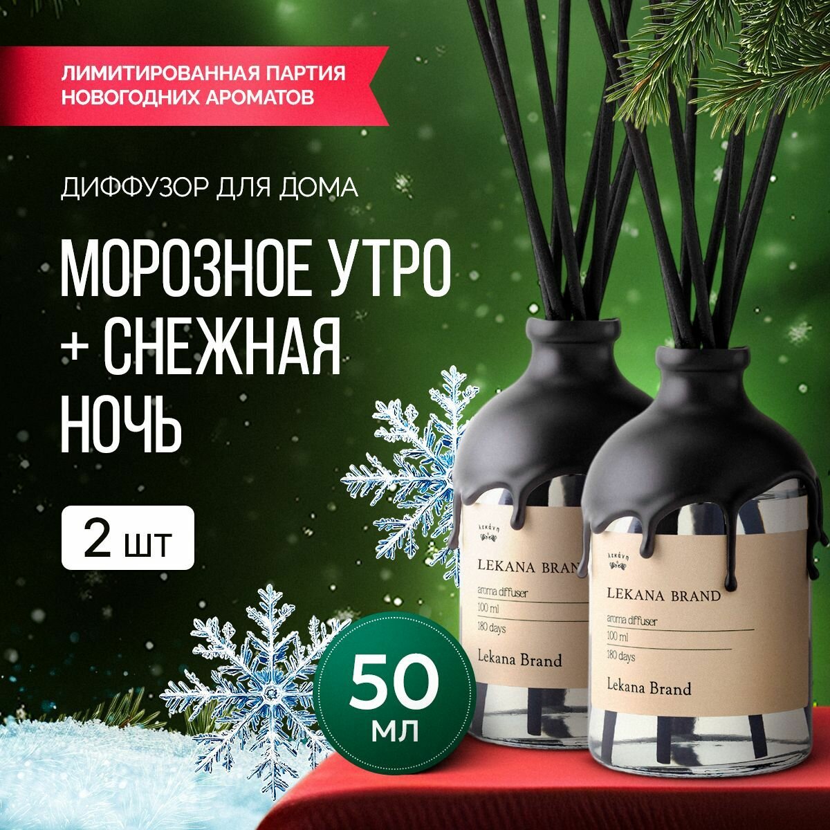 Купить Ароматический диффузор для дома, набор Снежная ночь+Морозное утро, 2*50 мл, Ароматизатор для офиса с палочками пахучка