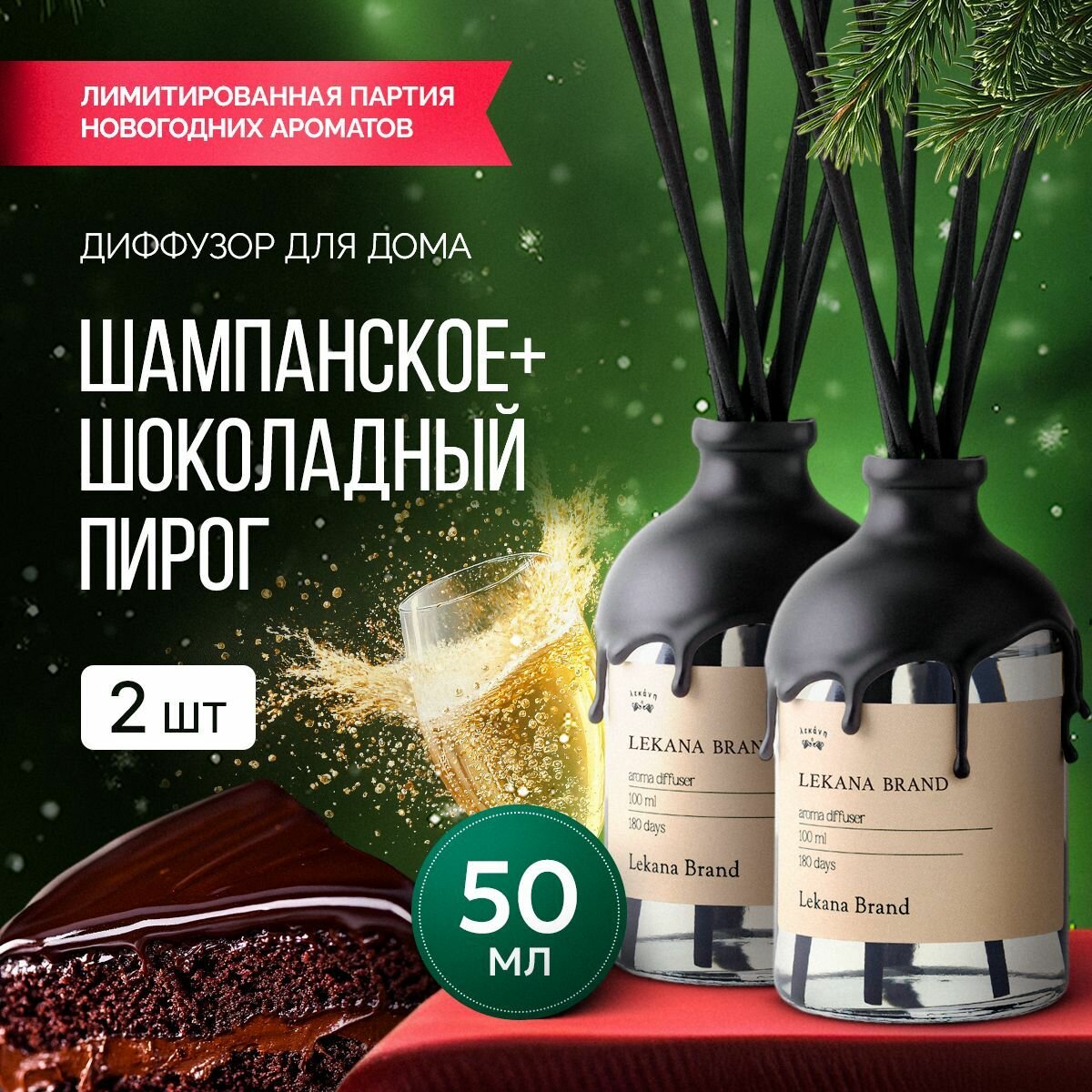 Купить Ароматический диффузор для дома, набор Шампанское+Шоколадный пирог, 2*50 мл, Ароматизатор для офиса с палочками пахучка