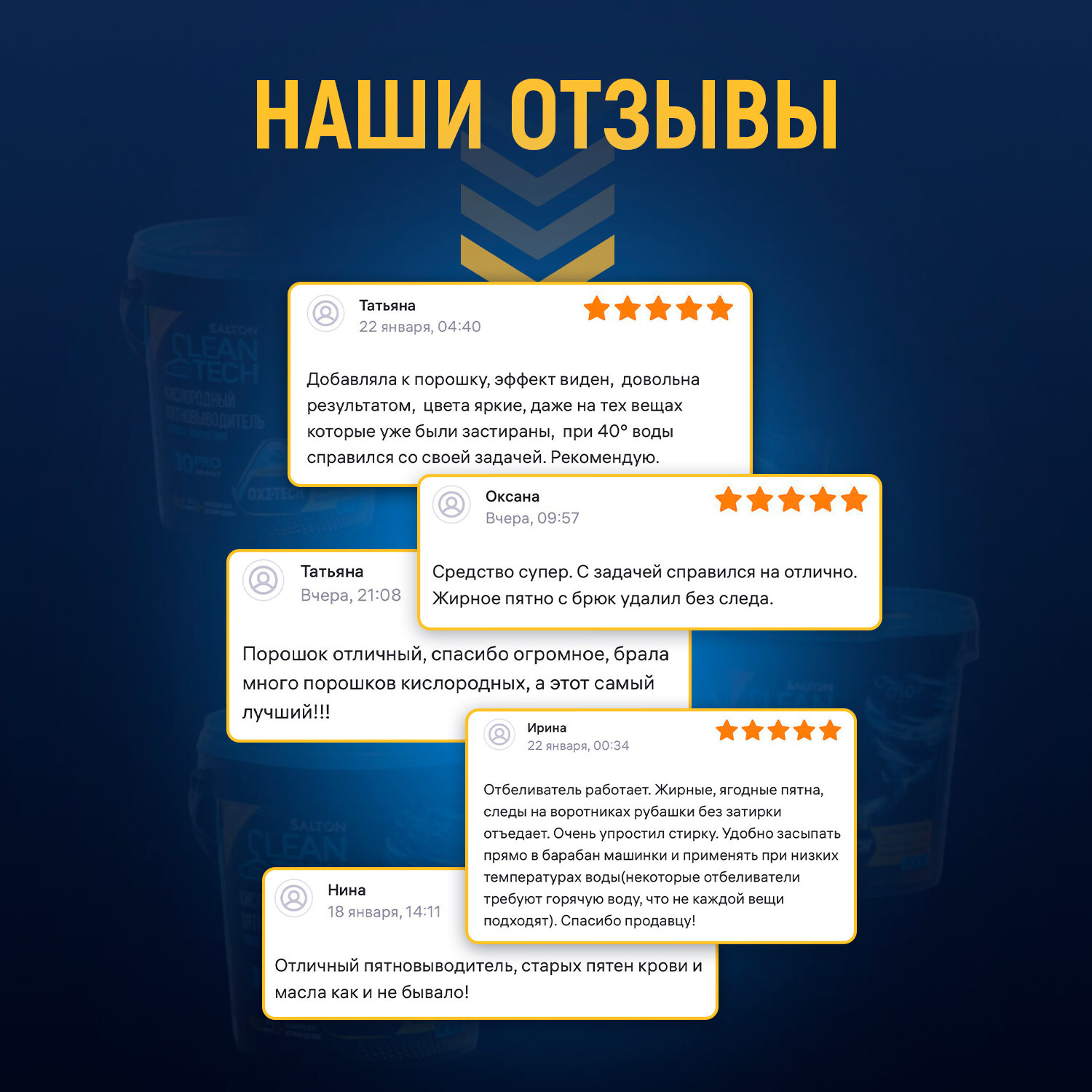 Ниже Вы можете прочитать отзывы на Пятновыводитель Salton CleanTech кислородный, 900 г, ознакомится с подробными характеристиками, посмотреть интересные обзоры и фотографии на Пятновыводитель Salton CleanTech кислородный, 900 г.