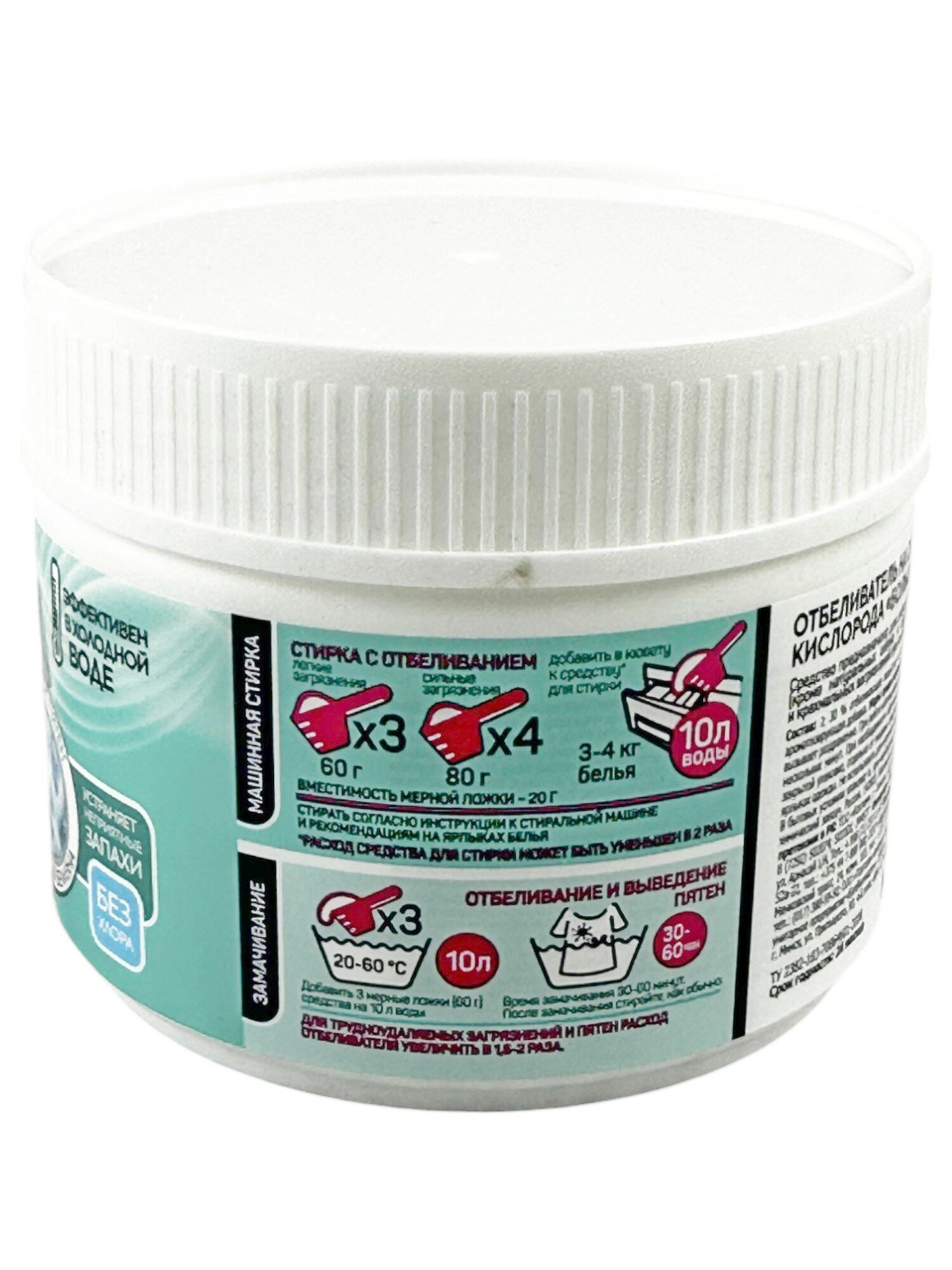 | Способ применения | На 3–4кг белья: 50–70г – слабые загрязнения 70–80г – сильные загрязнения. Отбеливание, выведение пятен: – изделия из хлопка, льна, вискозы, штапеля, синтетические ткани – 70г. Для трудноудаляемых загрязнений и пятен расход отбеливателя увеличить в 1,5 раза. Не использовать для непрочно окрашенных тканей. Соблюдать рекомендации на ярлыках одежды. Не смешивать с хлорсодержащими отбеливателями. |