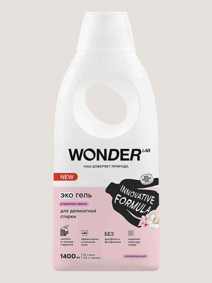 Эко гель для стирки деликатных тканей WONDER LAB, гипоаллергенный, с ароматом утренних цветов WONDER LAB, 28 стирок, 1,4л