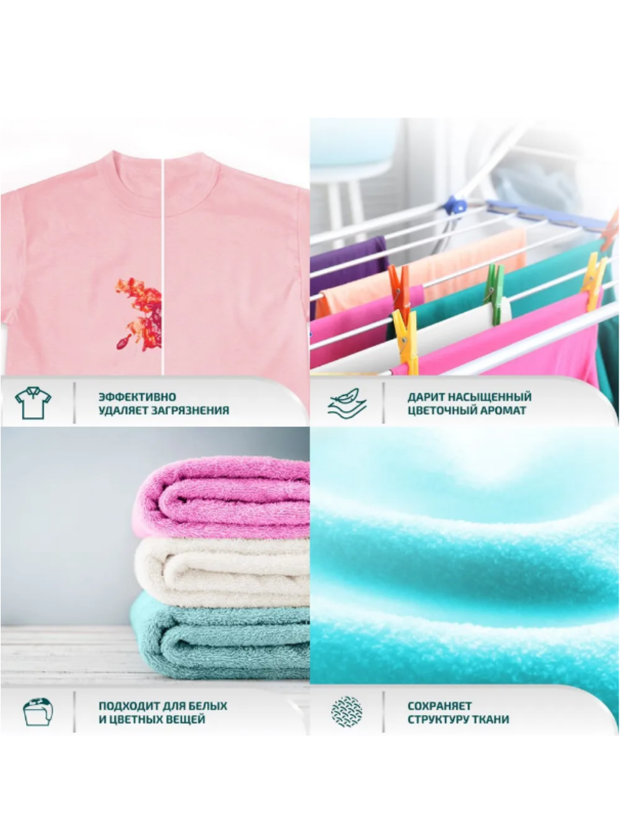 | Эффект | антибактериальный / антистатический / восстановление цвета / отбеливание / придание мягкости / устранение неприятных запахов |