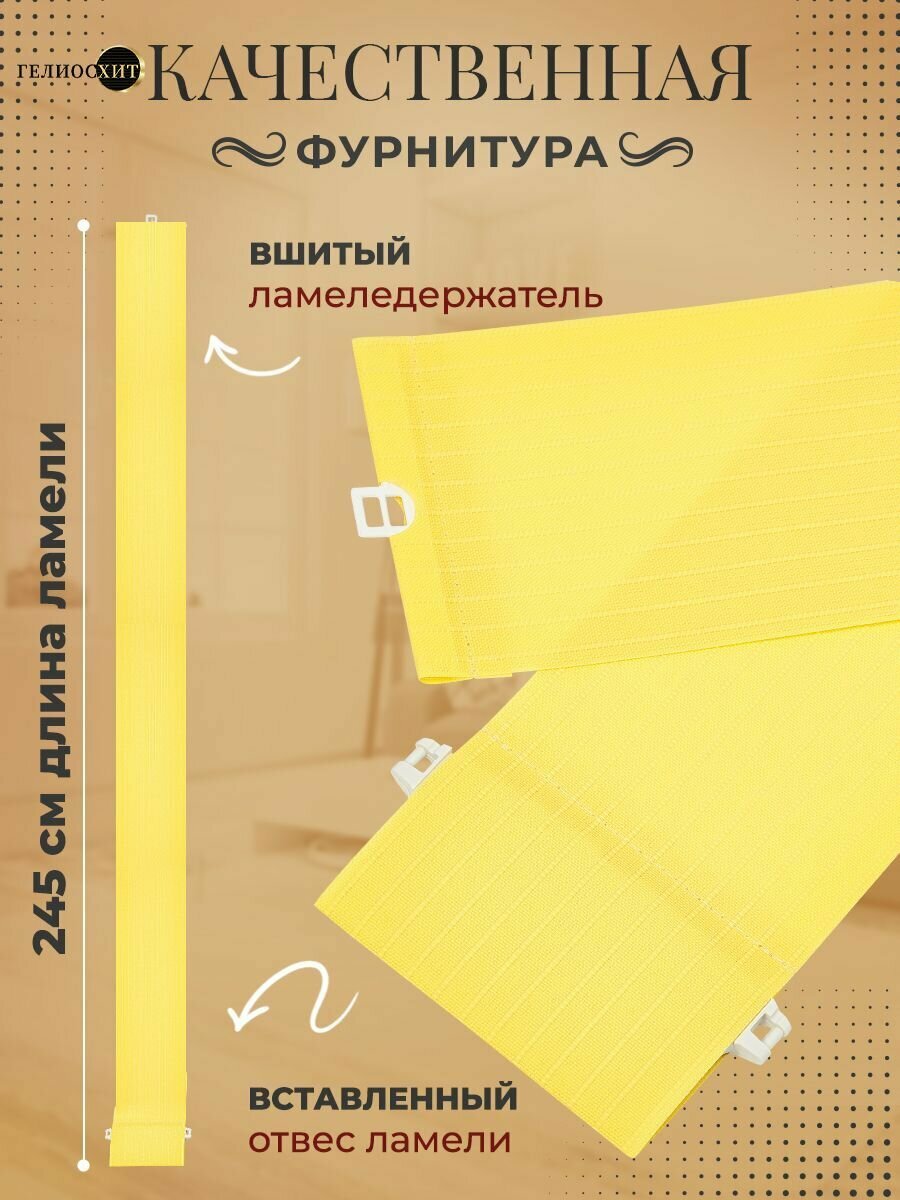 СохранитьЛамели для вертикальных жалюзи 20 шт высотой 245 см желтого цвета (карниз приобретается отдельно), гелиосхит. интересное: