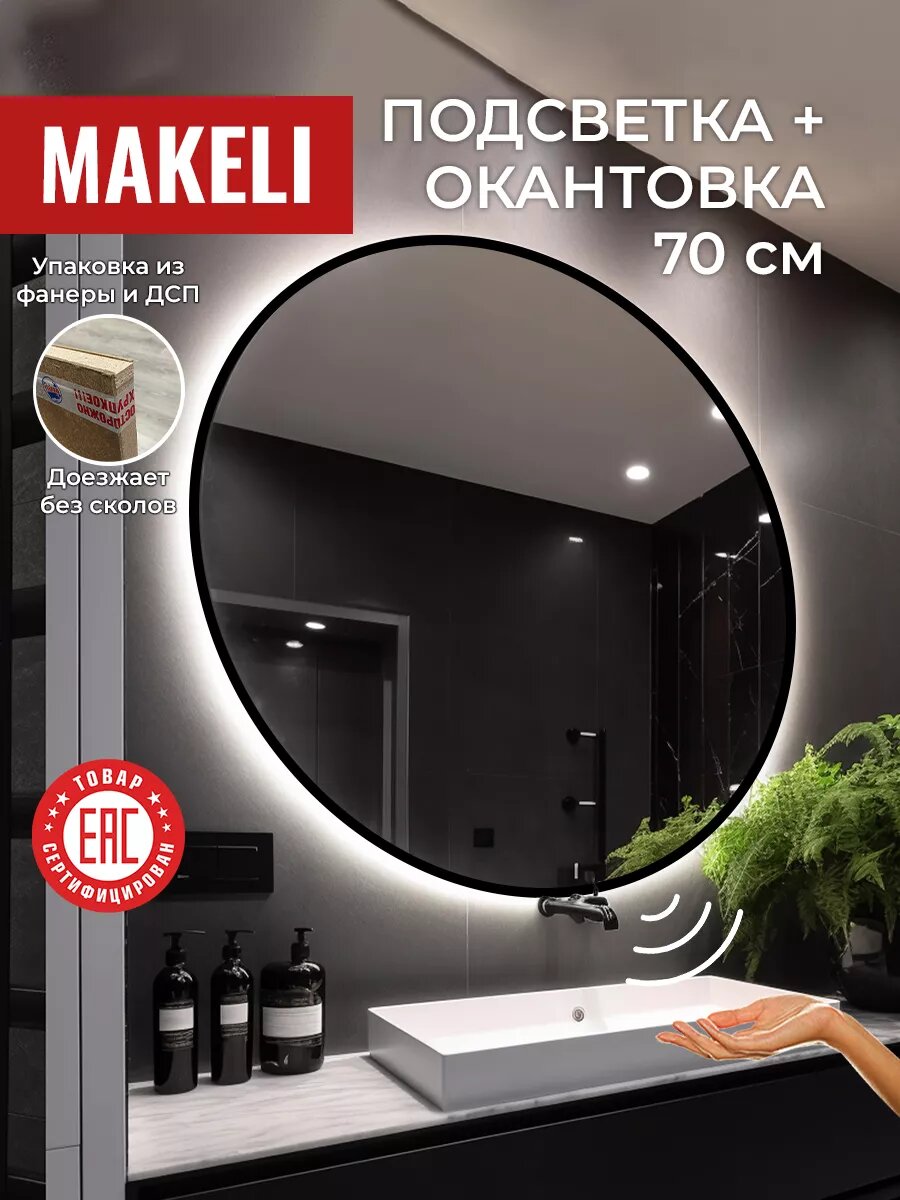 Круглое зеркало MAKELI с подсветкой 50 см с черной окантовкой
