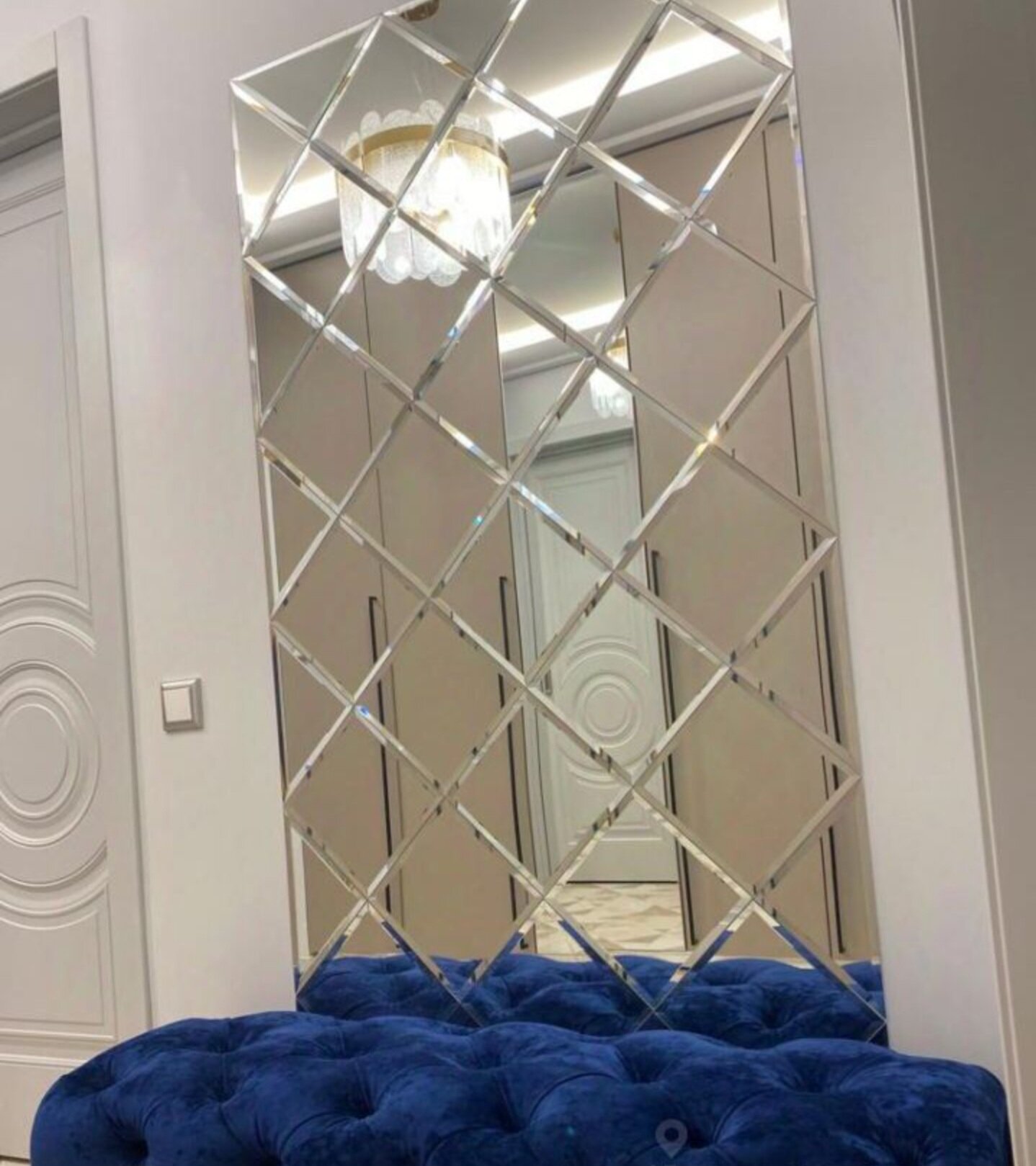 Зеркальное панно "Стеклография" с фацетом, на стену 204,5 см. х 255 см. зеркальная плитка из квадратов и треугольников.