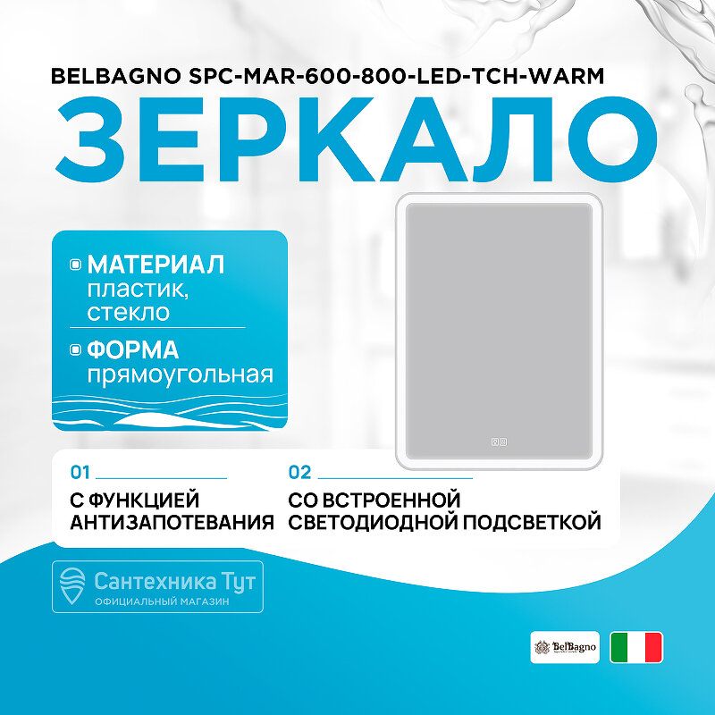 Зеркало BelBagno SPC-MAR-600-800-LED-TCH-WARM с подсветкой с подогревом с сенсорным выключателем