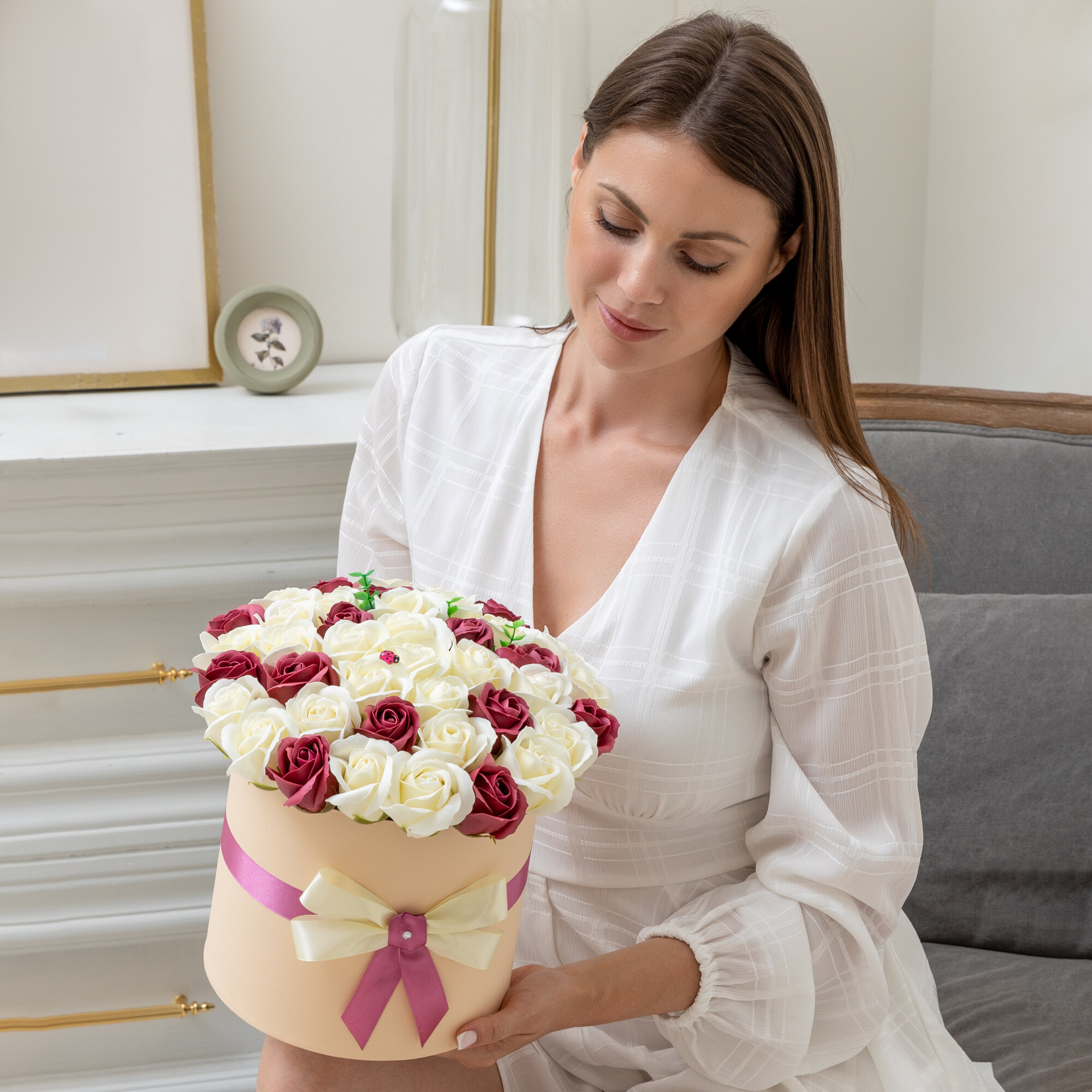 Купить Букет из мыльных цветов "Нежность" в подарочной шляпной коробке с бантом