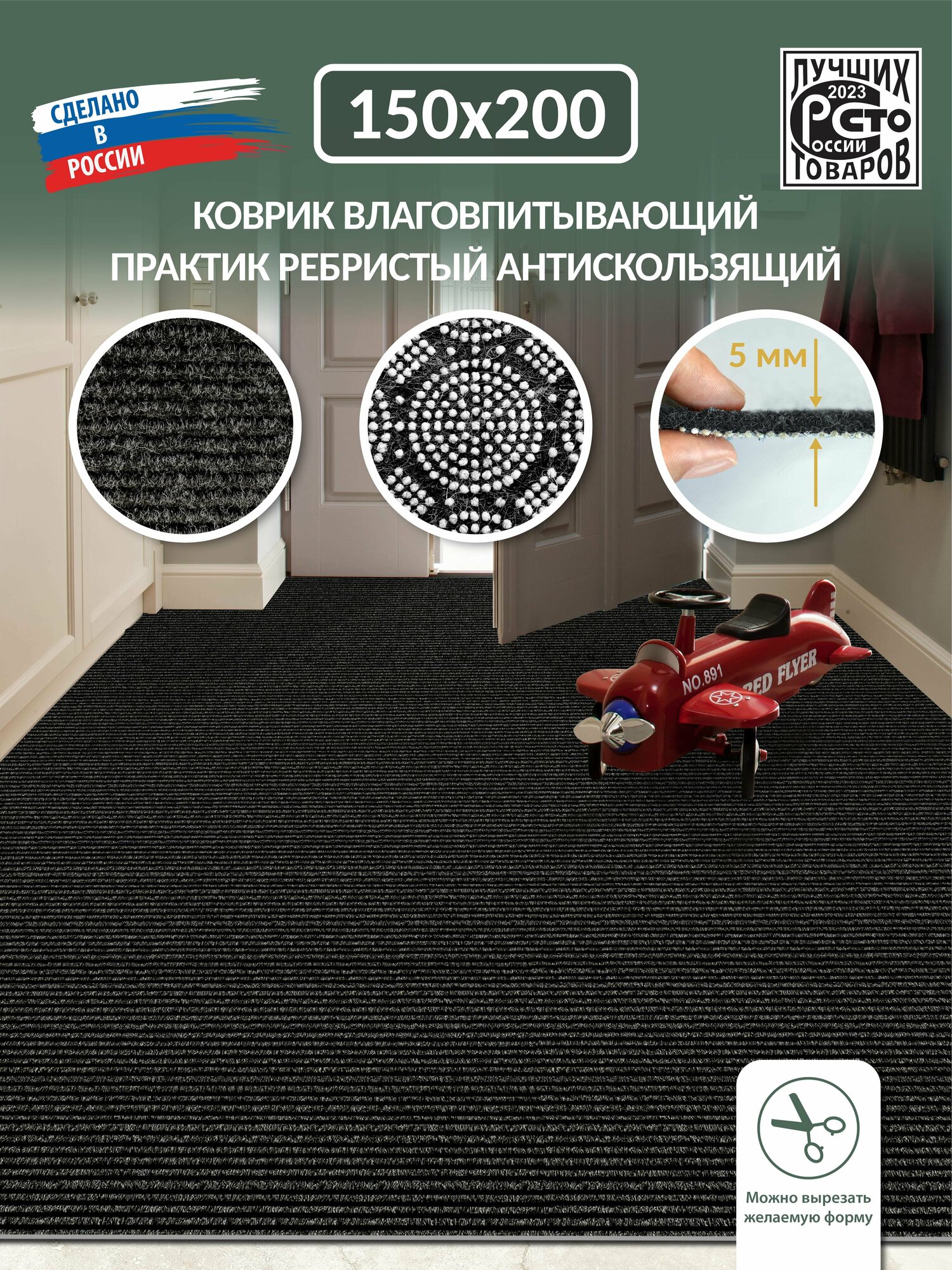 Коврик вырезной придверный icarpet практик антискользящий влаговпитывающий 150х200 черный
