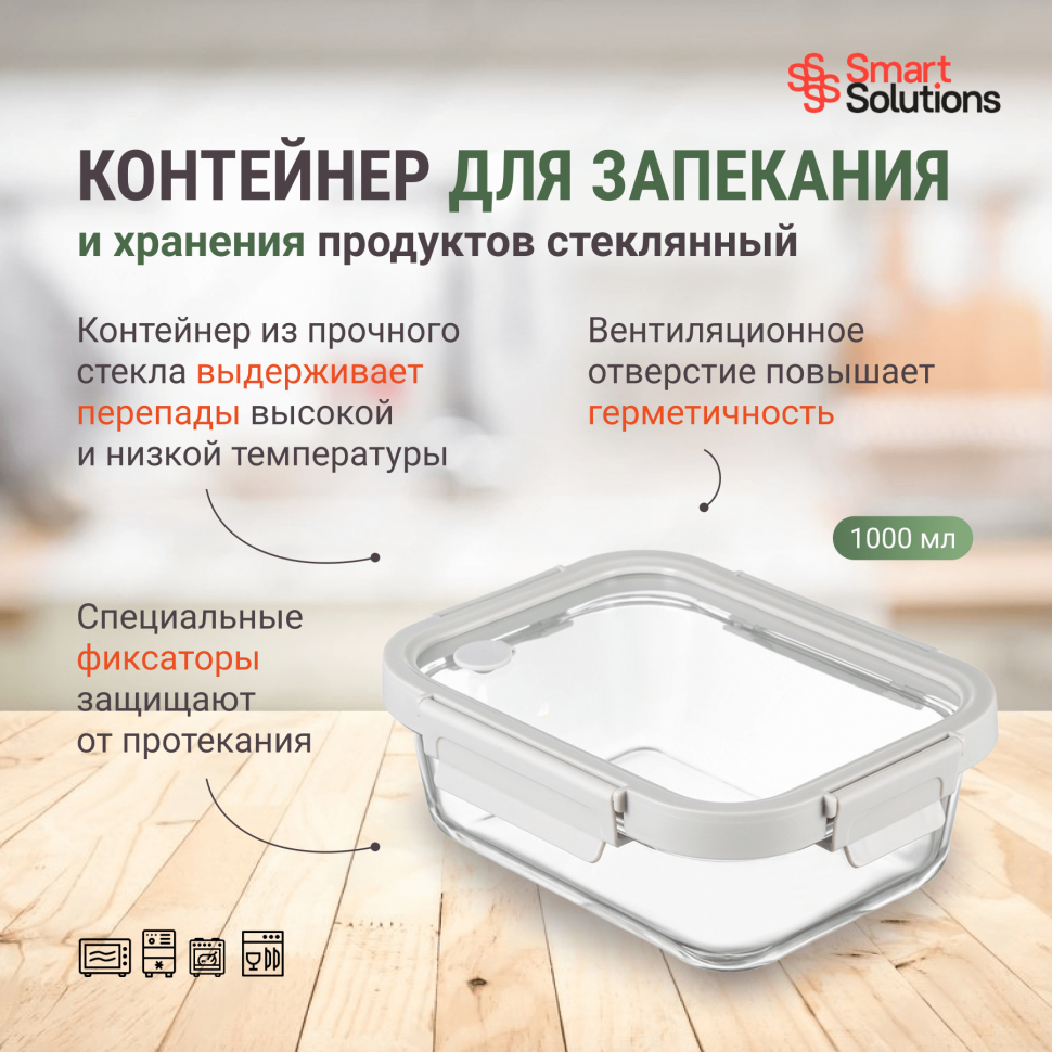 Контейнер для хранения и переноски продуктов 1040 мл для запекания стеклянный прозрачный Smart Solutions SS000042