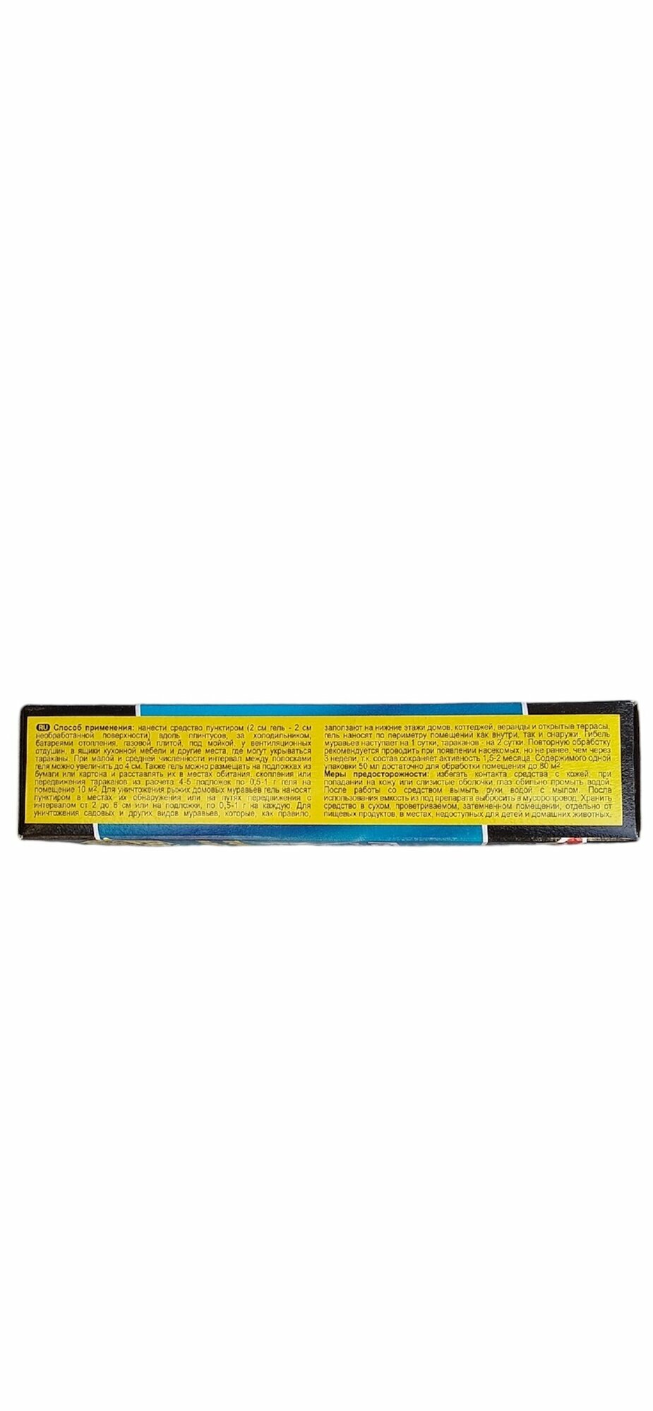 | Способ применения | для уничтожения тараканов перед обработкой проведите уборку помещения, плотно закройте водопроводные краны и ёмкости с водой, лишив насекомых источников влаги; наносите гель пунктирной линией вдоль плинтусов, в щели и отверстия, в которых могут укрываться тараканы; при малой и средней численности тараканов расход средства: 2 см геля на 4-6 см обрабатываемой поверхности; при большой численности 2 см геля на 2 см поверхности; гель можно нанести полосками или каплями на небольшие листочки бумаги и разложить их в местах обитания насекомых; полная гибель тараканов наступает на вторые сутки; для уничтожения муравьёв нанесите гель пунктиром в местах обнаружения или передвижения насекомых с интервалом в 2-4 см между полосками; полная гибель наступает на 2‒3 сутки; повторную обработку следует проводить не ранее, чем через 4 недели; остаточное действие сохраняется 1,5‒2 месяца |