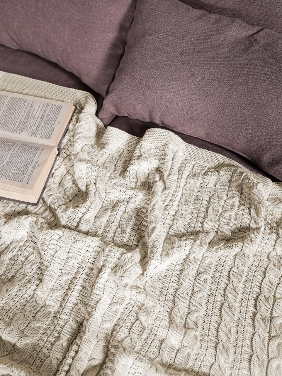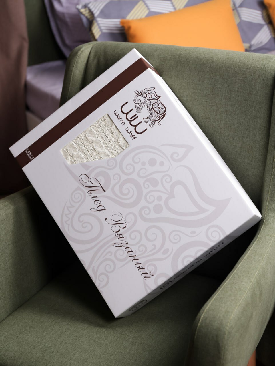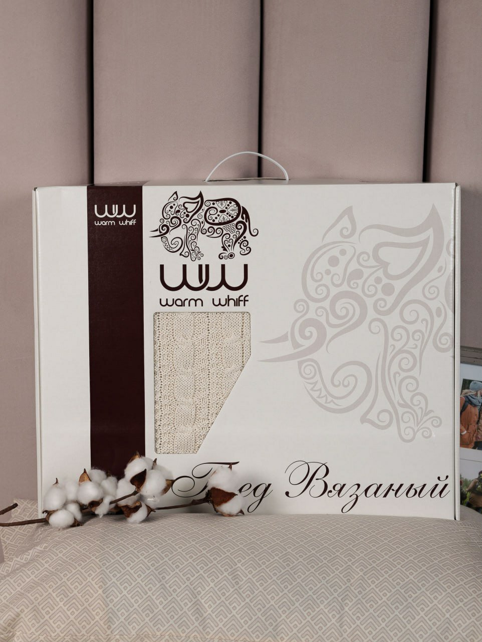 Плед 180х220, вязаный, Warm Whiff, бежевый, хлопок, покрывало на кровать, на диван, на кресло, в подарочной коробке