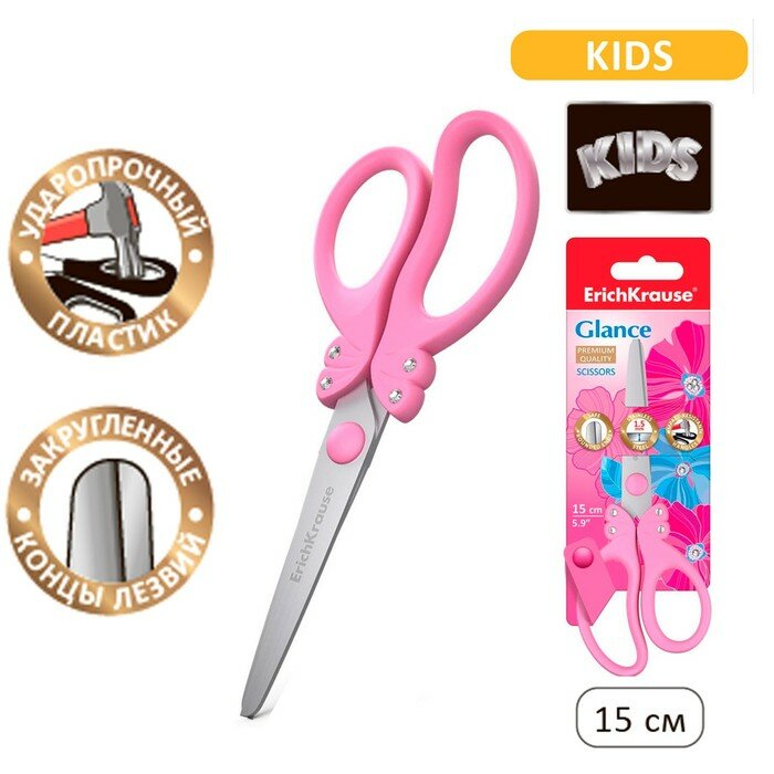 Ножницы детские 15 см, ErichKrause Glance, со стразами, с закруглёнными концами лезвий, микс