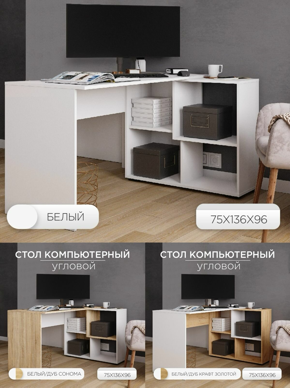 СохранитьКомпьютерный стол угловой СКМУ-4, 75х136х96 см, универсальная сборка, Белый/Дуб крафт золотой интересное: