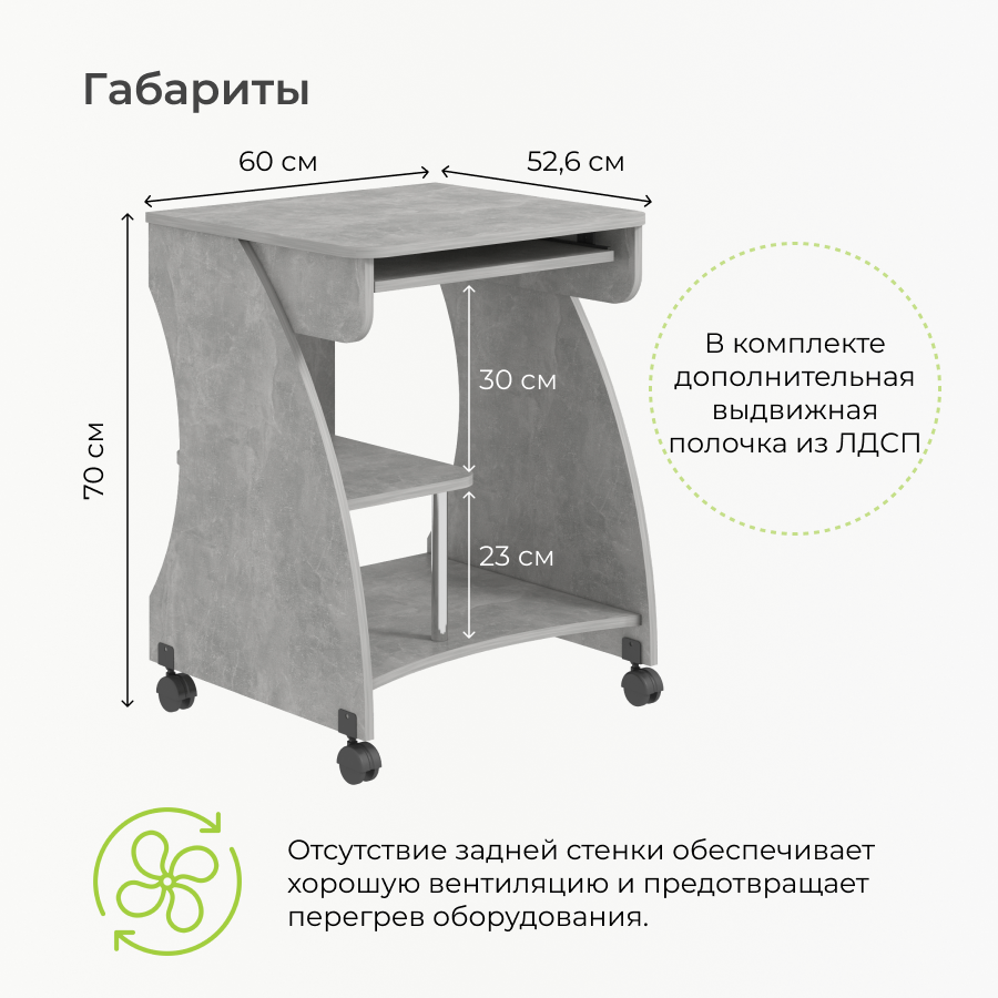 | Особенности | на колесах, надстройка, отделение для системного блока, полка для клавиатуры |
