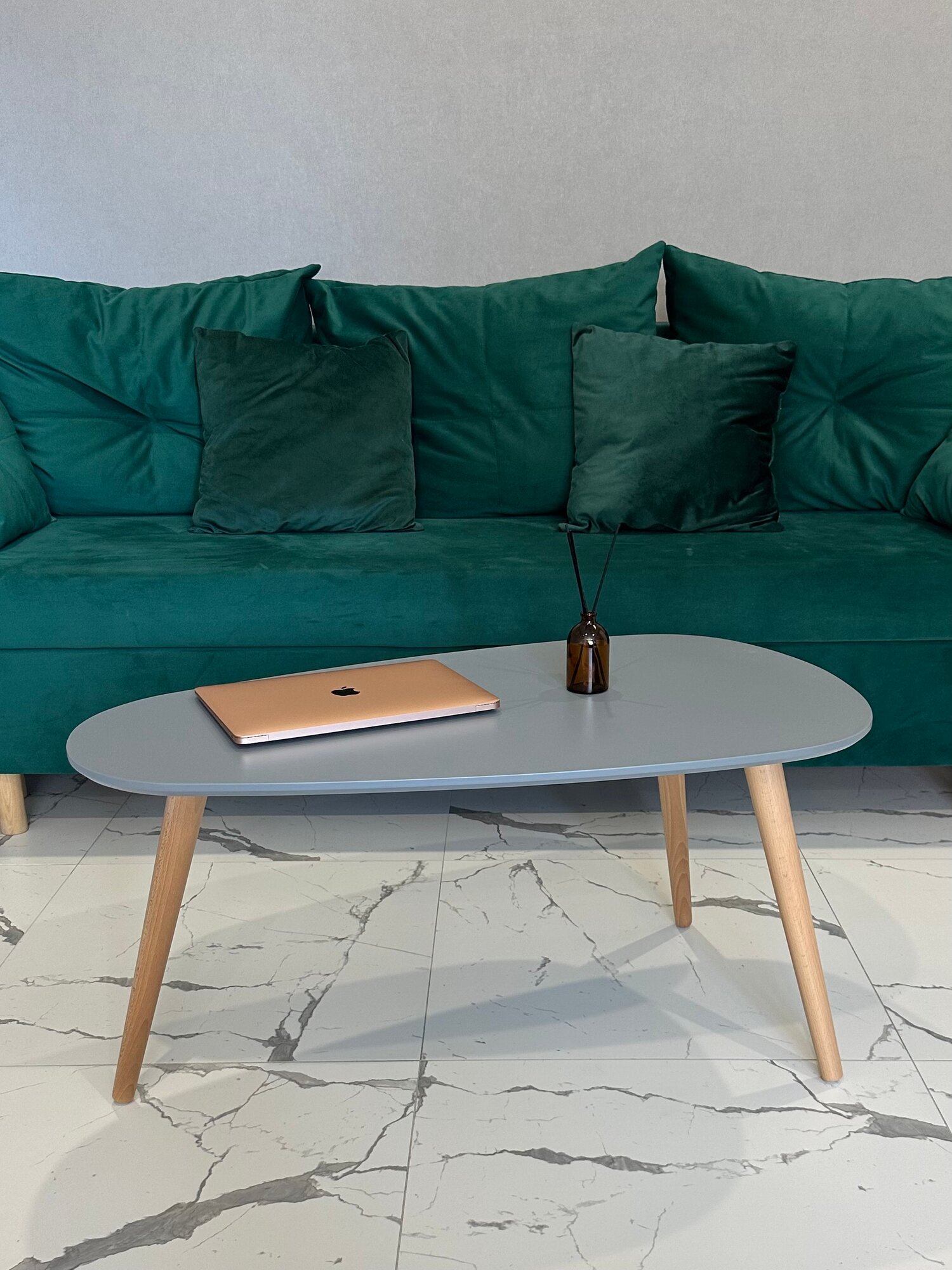 Журнальный столик "Нико" 90х50х45 см, массив дерева, МДФ, серый, 3 ножки, подпятники