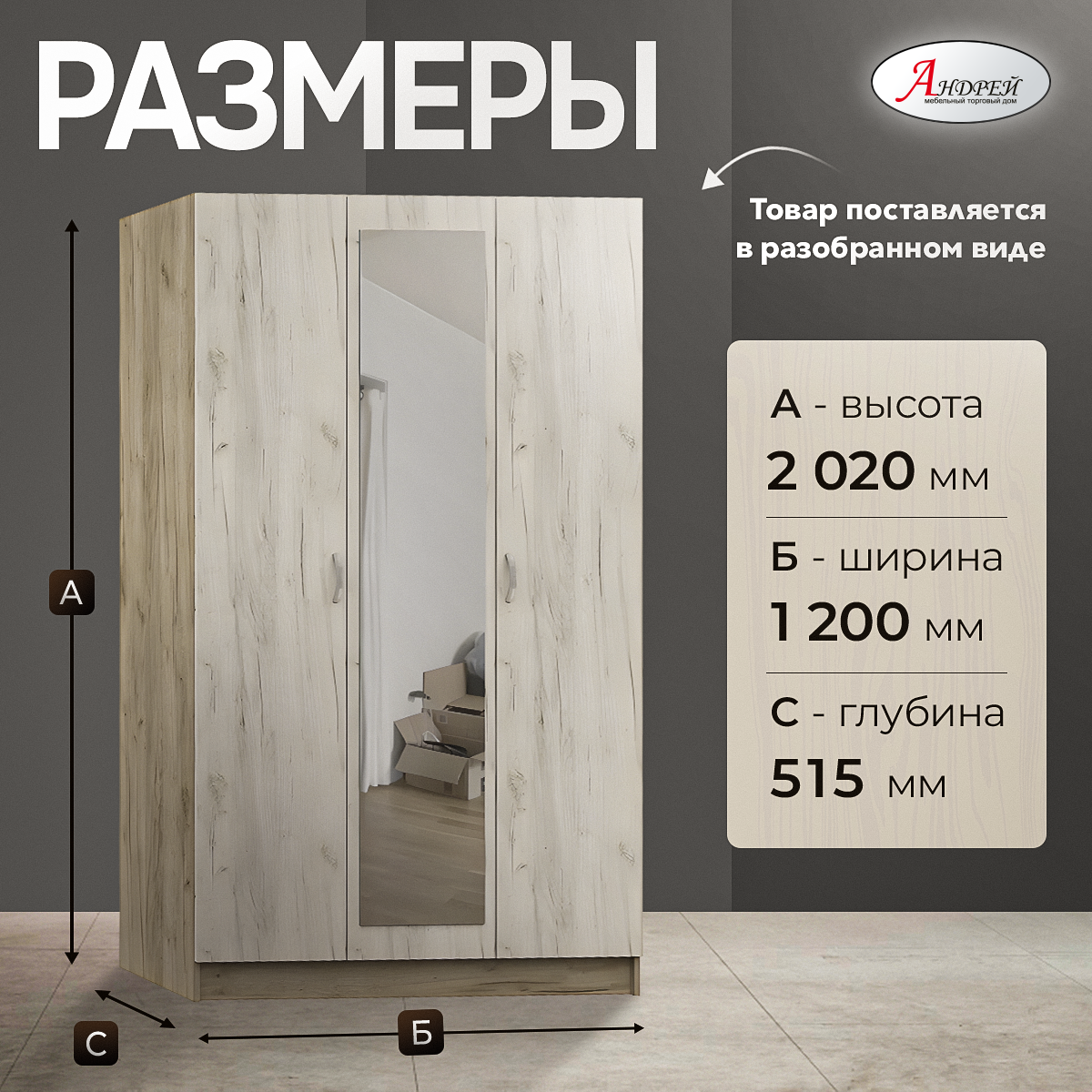 Шкаф для одежды трехстворчатый для спальни Басса ШК 553 (1,2х2,02х0,506) фасад Дуб Крафт Белый / корпус Дуб Крафт Серый