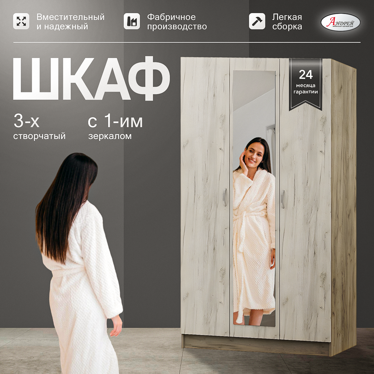 Шкаф купе Бася 3х дверный с зеркалом ШКК 551, Дуб крафт белый/Дуб крафт серый