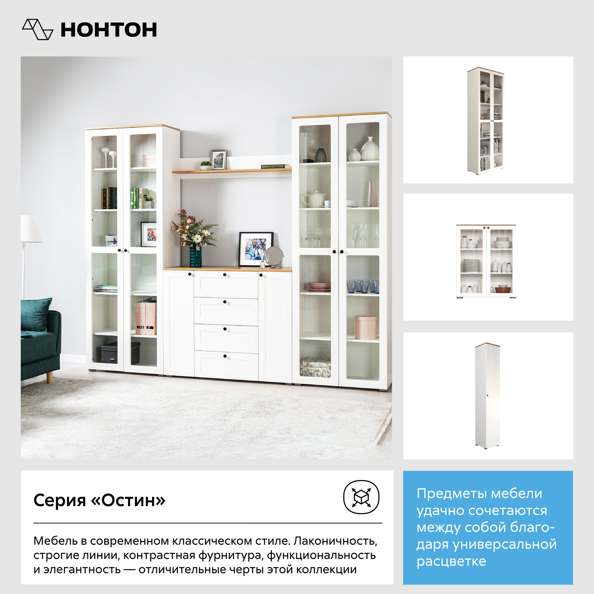 Шкаф-витрина Нонтон Остин белый шагрень / дуб крафт золотой 80 см