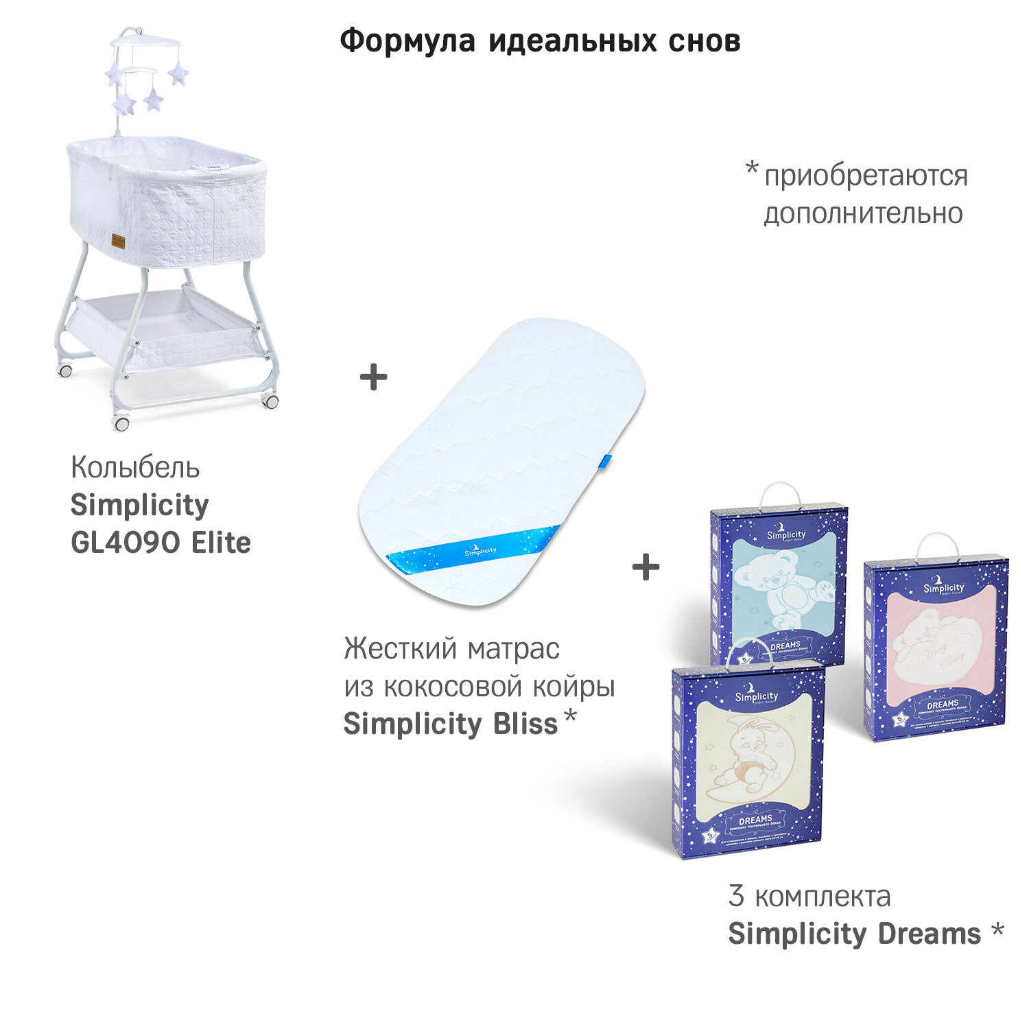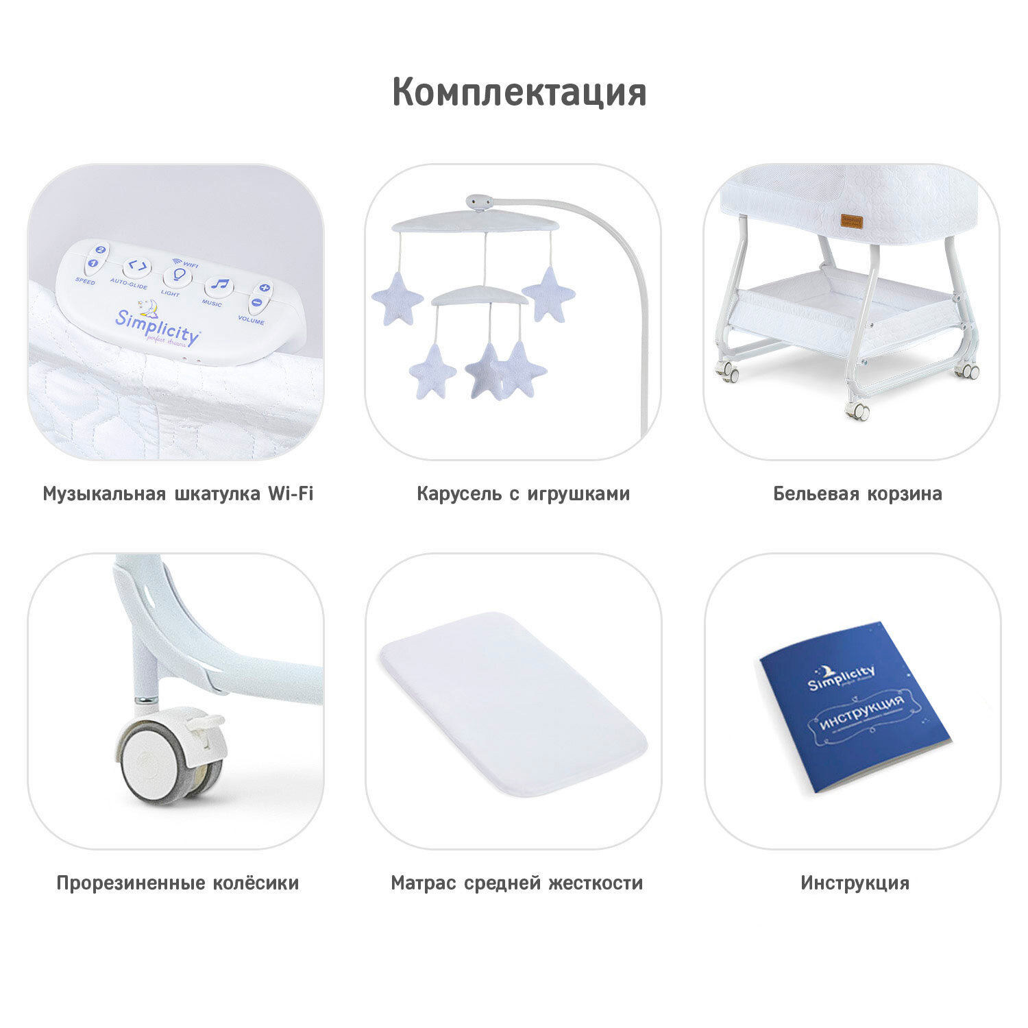 | Дополнительная информация | Колыбель, съёмный матрасик, наматрасник, музыкальная шкатулка, карусель с игрушками, электрошнур с адаптером, тканевая корзина для белья, маятник на магнитной подушке. |