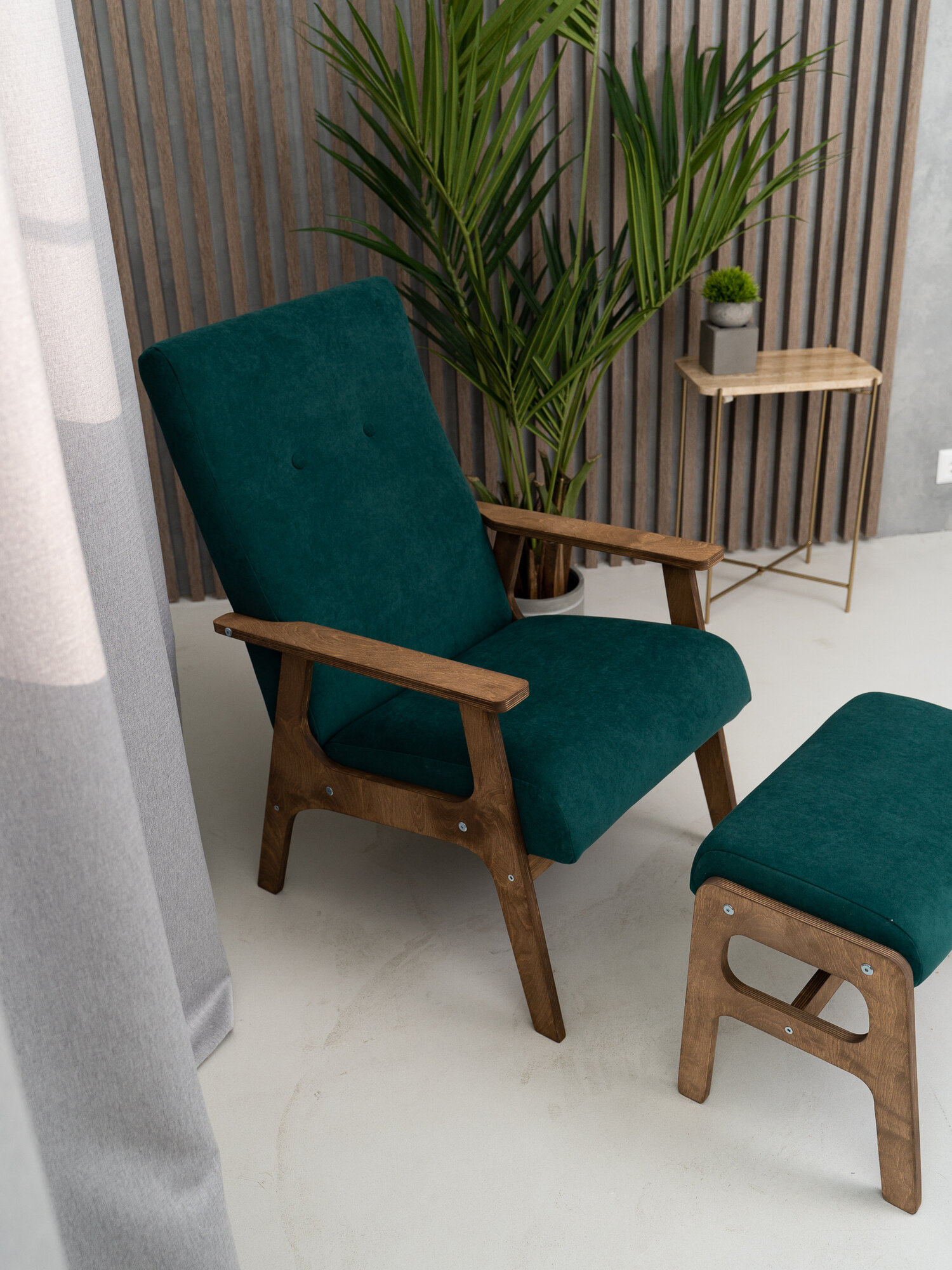 Купить Комплект Чилл ZASIDELIS кресло с пуфом для ног, велюр, изумрудный, ноги коричневое масло